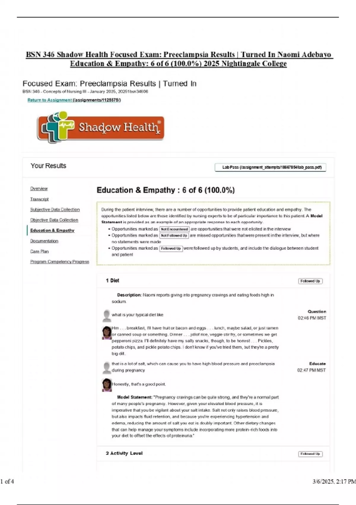 BSN 346 Shadow Health Focused Exam: Preeclampsia Results | Turned In Naomi Adebayo Education & Empathy: 6 of 6 (100.0%) 2025 Nightingale College