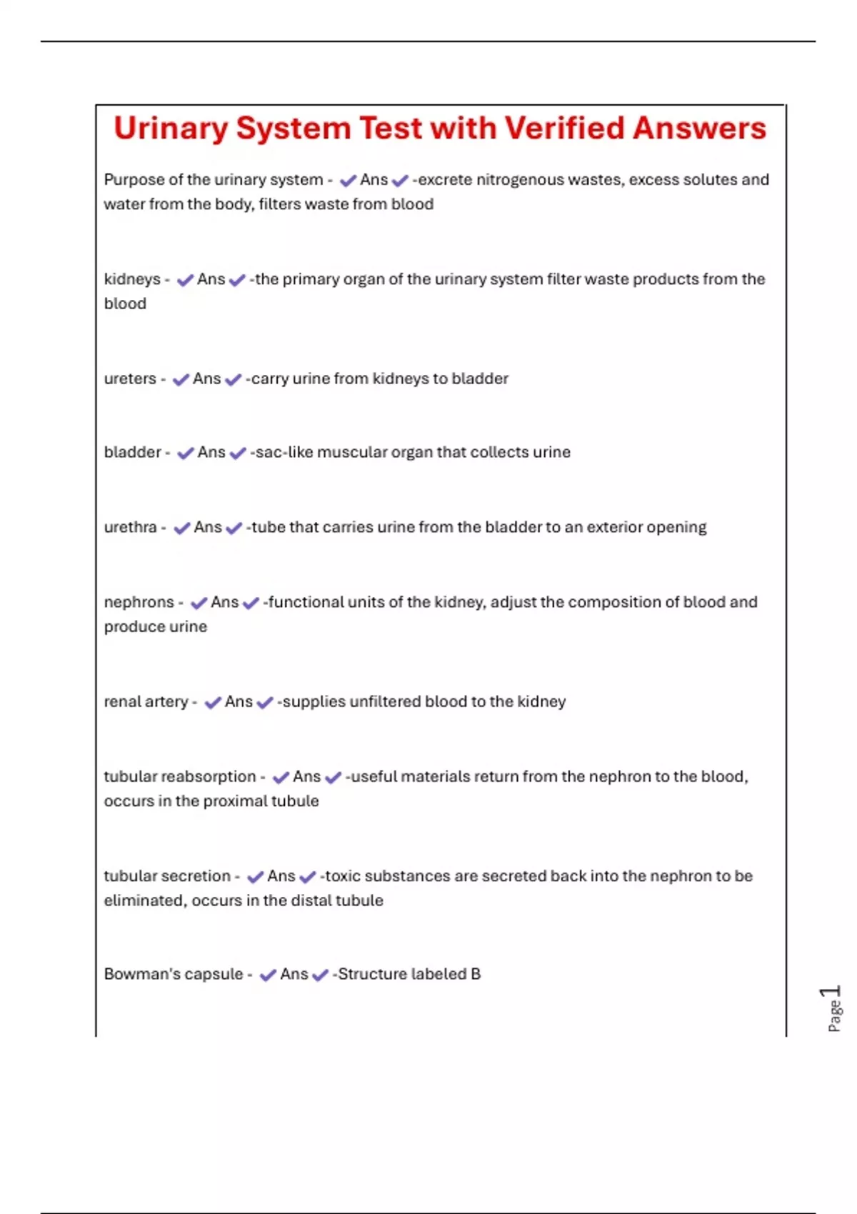 Purpose of the urinary system - Ans -excrete nitrogenous wastes, excess solutes and
