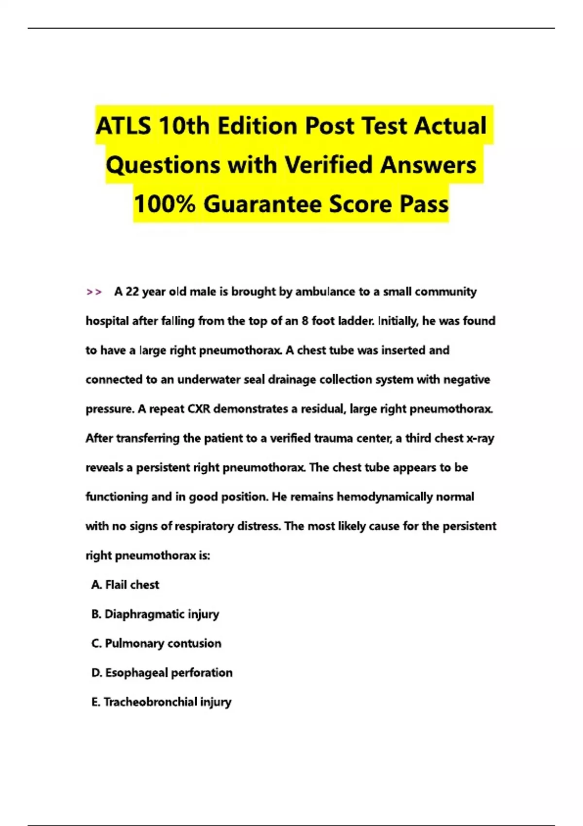 ATLS 10th Edition Post Test Actual Questions with Verified Answers 100% Guarantee Score Pass ATLS 10th Edition Post Test Actual Questions with Verified Answers 100% Guarantee Score Pass