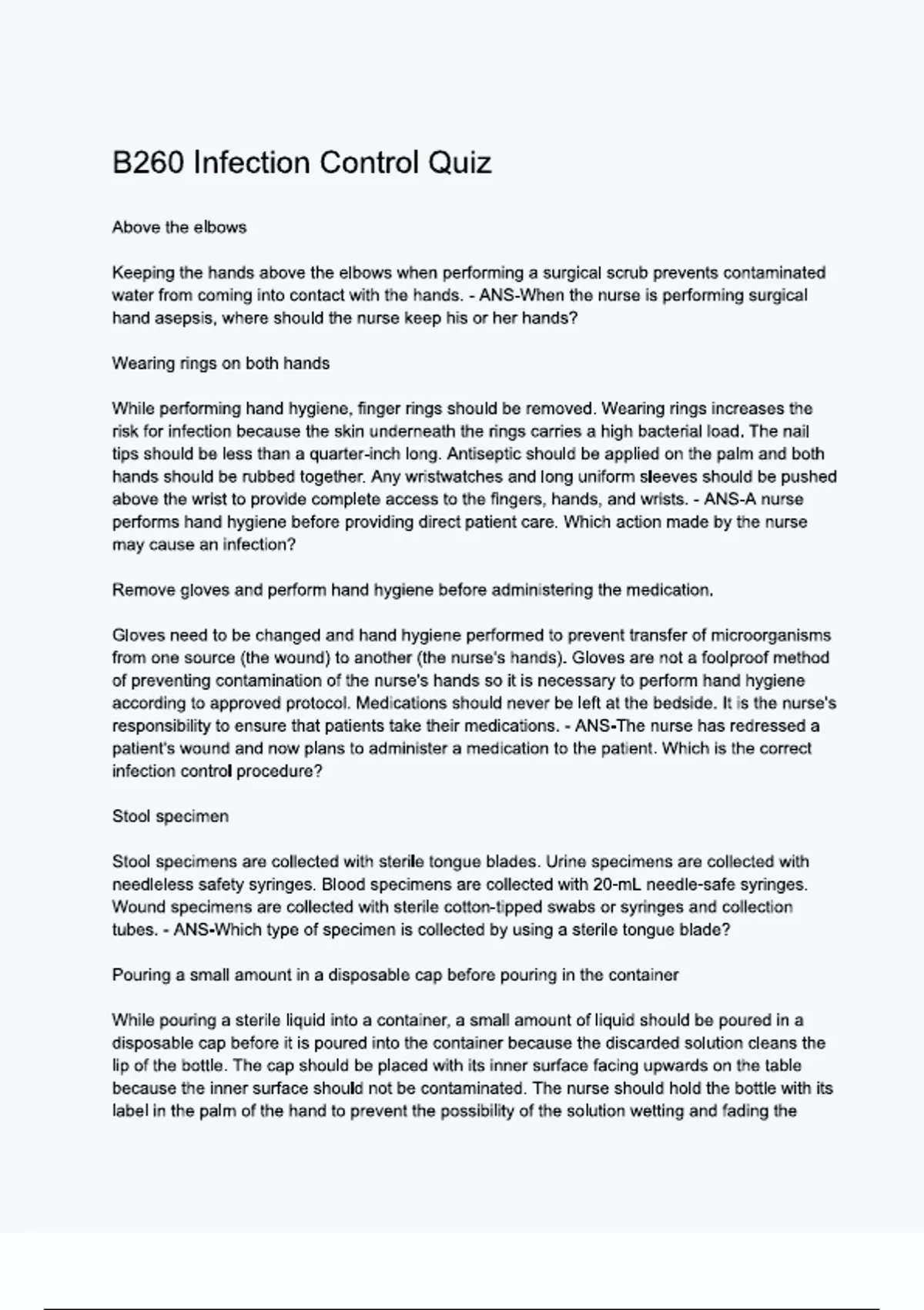 B260 Infection Control Quiz with Correct answers