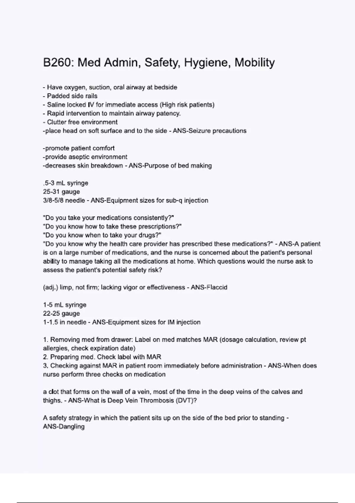 B260 Med Admin, Safety, Hygiene, Mobility Exam Questions and Answers