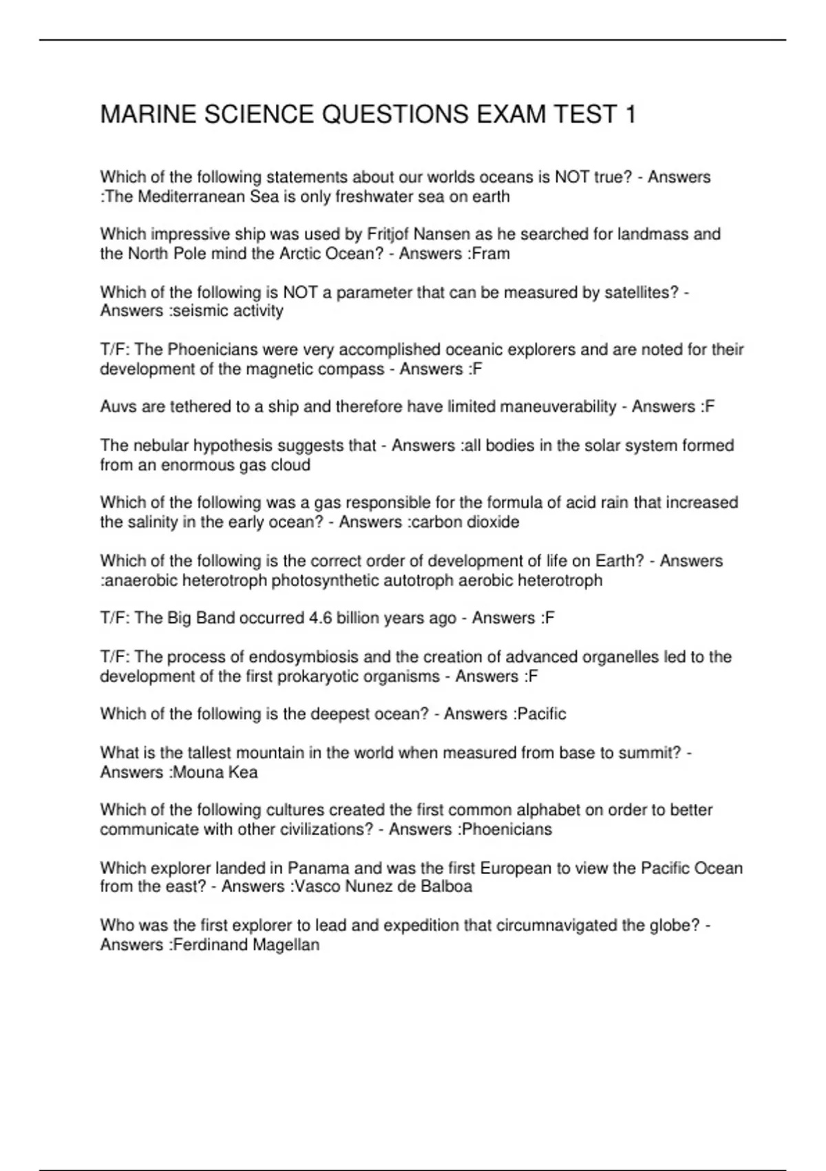 MARINE SCIENCE QUESTIONS EXAM TEST 1