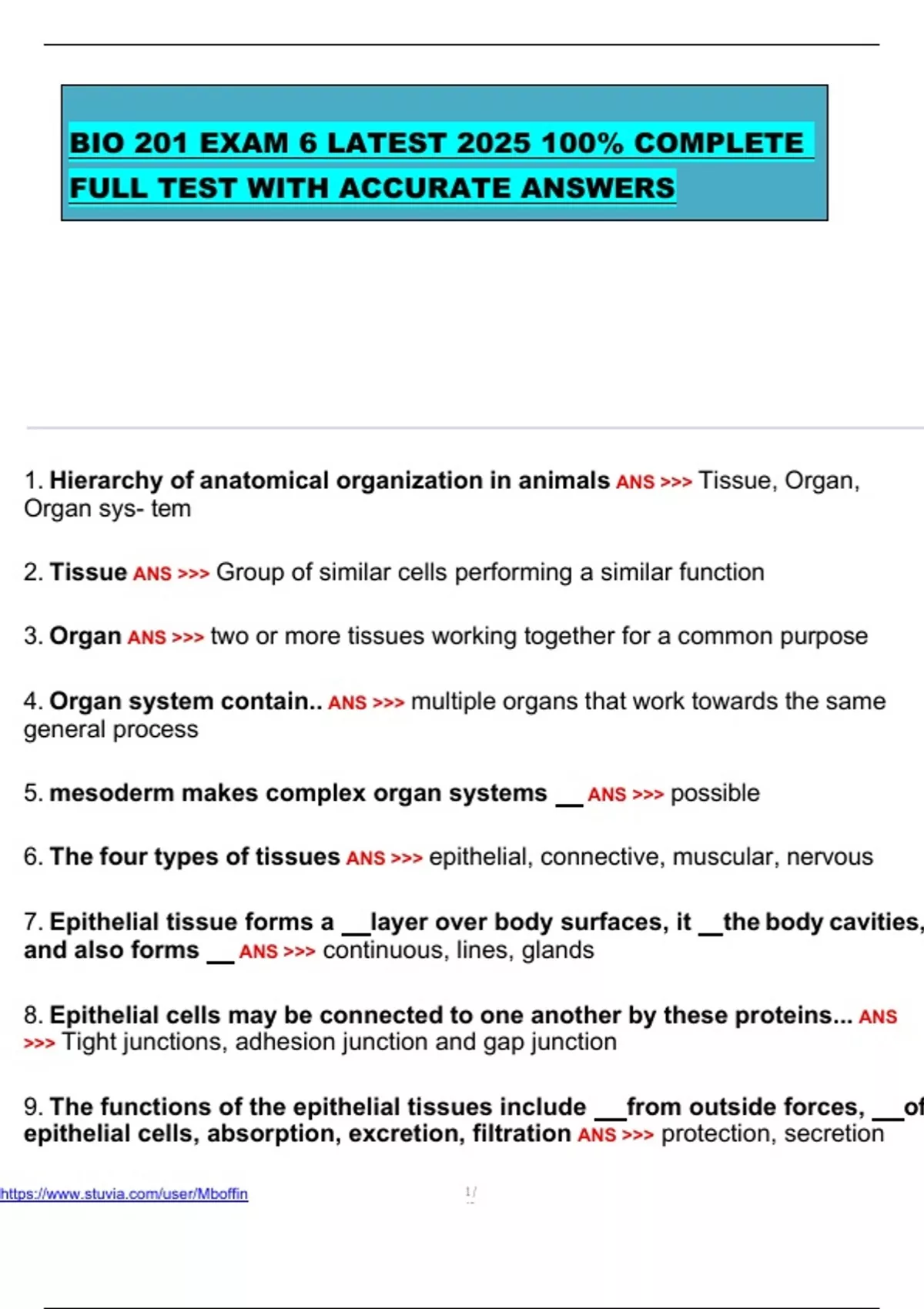BIO 201 EXAM 6 LATEST 2025 100% COMPLETE FULL TEST WITH ACCURATE ANSWERS 1. Hierarchy of anatomical organization in animals ANS >>> Tissue, Organ, Organ sys- tem 2. Tissue ANS >>> Group of similar cells performing a similar function 3. Organ ANS >>> two or more tissues working together for a common purpose 4. Organ system contain.. ANS >>> multiple organs that work towards the same general process 5. mesoderm makes complex organ systems ANS >>> possible 6. The four types of tissues ANS >>> epithelial, connective, muscular, nervous 7. Epithelial tissue forms a layer over body surfaces, it the body cavities, and also forms ANS >>> continuous, lines, glands