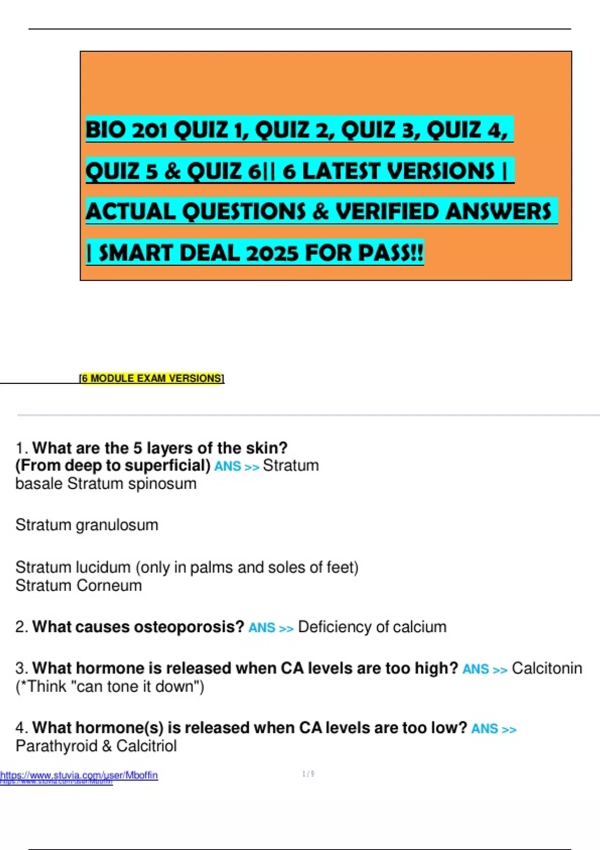 BIO 201 QUIZ 1, QUIZ 2, QUIZ 3, QUIZ 4, QUIZ 5 & QUIZ 6|| 6 LATEST VERSIONS | ACTUAL QUESTIONS & VERIFIED ANSWERS | SMART DEAL 2025 FOR PASS!! [6 MODULE EXAM VERSIONS] 1. What are the 5 layers of the skin? (From deep to superficial) ANS >> Stratum basale Stratum spinosum Stratum granulosum Stratum lucidum (only in palms and soles of feet) Stratum Corneum 2. What causes osteoporosis? ANS >> Deficiency of calcium 3. What hormone is released when CA levels are too high? ANS >> Calcitonin (*Think "can tone it down") 4. What hormone(s) is released when CA levels are too low? ANS >> Parathyroid & Calcitriol