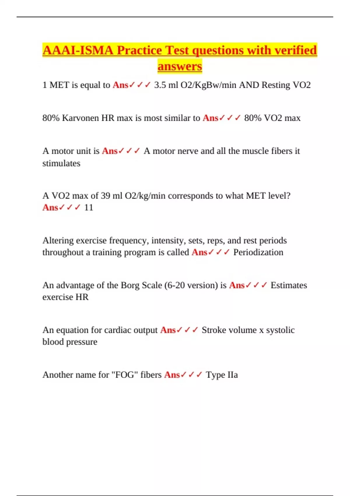 This document features a complete set of verified practice test questions and answers for the AAAI/ISMA Personal Training Certification. It includes topics such as METs, VO2 max, muscle fiber types, cardiac output, resistance training design, endocrine function, energy systems, biomechanics, flexibility, injury prevention, heart rate zones, and common chronic conditions. Designed for fitness professionals preparing for certification or reviewing essential exercise science.