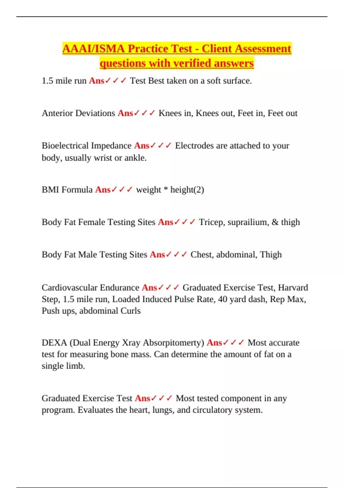 AAAI/ISMA Practice Test – Client Assessment Questions with Verified Answers – Body Composition, Posture, and Endurance Testing
