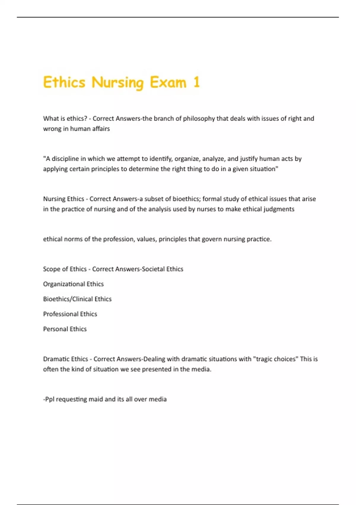 Nursing Ethics - Correct Answers-a subset of bioethics; formal study of ethical issues that arise