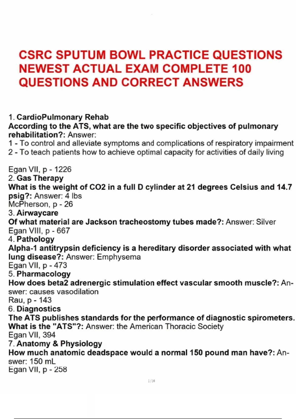 CSRC SPUTUM BOWL PRACTICE QUESTIONS NEWEST ACTUAL EXAM COMPLETE 100 QUESTIONS AND CORRECT ANSWERSCSRC SPUTUM BOWL PRACTICE QUESTIONS NEWEST ACTUAL EXAM COMPLETE 100 QUESTIONS AND CORRECT ANSWERSCSRC SPUTUM BOWL PRACTICE QUESTIONS NEWEST ACTUAL EXAM COMPLETE 100 QUESTIONS AND CORRECT ANSWERSCSRC SPUTUM BOWL PRACTICE QUESTIONS NEWEST ACTUAL EXAM COMPLETE 100 QUESTIONS AND CORRECT ANSWERSCSRC SPUTUM BOWL PRACTICE QUESTIONS NEWEST ACTUAL EXAM COMPLETE 100 QUESTIONS AND CORRECT ANSWERS 1. CardioPulmonary Rehab According to the ATS, what are the two specific objectives of pulmonary rehabilitation?: Answer: 1 - To control and alleviate symptoms and complications of respiratory impairment 2 - To teach patients how to achieve optimal capacity for activities of daily living Egan VII, p - 1226 2. Gas Therapy What is the weight of CO2 in a full D cylinder at 21 degrees Celsius and 14.7 psig?: Answer: 4 lbs McPherson, p - 26 3. Airwaycare Of what material are Jackson tracheostomy tubes made?: Answer: Silver Egan VIII, p - 667 4. Pathology Alpha-1 antitrypsin deficiency is a hereditary disorder associated with what lung disease?: Answer: Emphysema Egan VII, p - 473 5. Pharmacology How does beta2 adrenergic stimulation effect vascular smooth muscle?: An- swer: causes vasodilation Rau, p - 143 6. Diagnostics The ATS publishes standards for the performance of diagnostic spirometers. What is the "ATS"?: Answer: the American Thoracic Society Egan VII, 394 7. Anatomy & Physiology How much anatomic deadspace would a normal 150 pound man have?: An- swer: 150 mL Egan VII, p - 258 8. Diagnostics What is the most common way to measure basal energy expenditure?: Answer: Indirect Calorimetry Wilkins V, p - 346 9. Pathology What is the source of the sound energy for wheezes?: Answer: Vibration of the wall of a narrowed or compressed airway. Wilkins V, p - 79 10. Anatomy & Physiology What are the normal PO2 and PCO2 in the fetal umbilical artery?: Answer: PO2 - 19 ( 17 - 21 ) PCO2 - 47 ( 42 - 52 ) Egan V, p - 157 11. Diagnostics How is the reciprocal of airways resistance expressed in pulmonary function testing?: Answer: Airway conductance ( Gaw) Dantzker, p - 328 12. Anatomy & Physiology The base of the tongue is attached to the epiglottis by three folds forming a space which is a key landmark in oral intubation. What is this space called?- : Answer: the Vallecula Egan VII, p - 200 13. Anatomy & Physiology Clara cells, brush cells and Kulchinsky's cells develop within what stage of the Fetal period?: Answer: the Pseudoglandular Egan VIII, p - 141 14. Anatomy & Physiology Which abdominal muscle decreases the transverse diameter of the rib cage during contraction?: Answer: the External Oblique Egan VII, p - 189 15. Neonates & Pediatrics Because of their high metabolic rate, infants require more calories per kilo- gram than adults; approximately how much more?: Answer: Twice as much as adults Egan VII, p - 1008 16. Pharmacology Define "Therapeutic Index".: Answer: The ratio of the median lethal dose of a drug to its median effective dose ( LD50:ED50 ) Rau, p - 26 17. Airwaycare The ASTM is responsible