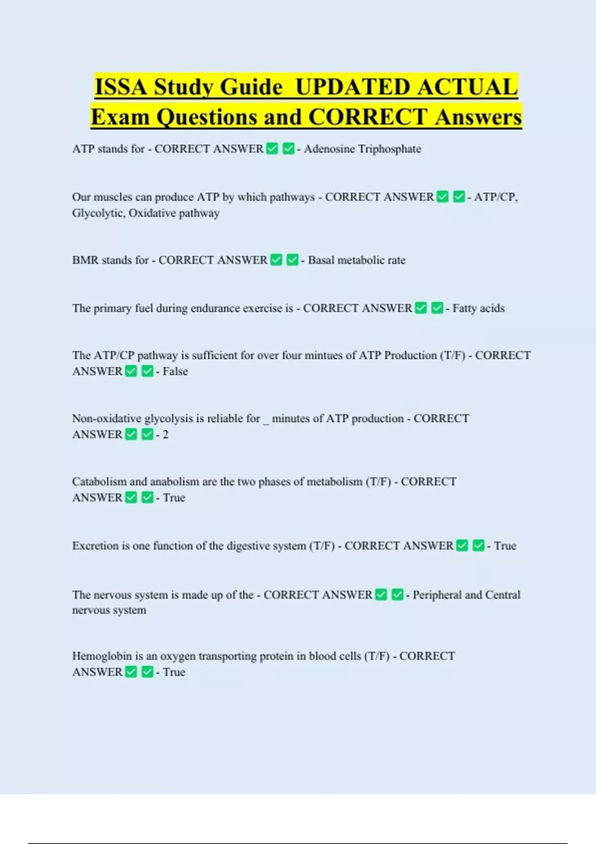 ISSA Study Guide UPDATED ACTUAL Exam Questions and CORRECT Answers ATP stands for - CORRECT ANSWER - Adenosine Triphosphate Our muscles can produce ATP by which pathways - CORRECT ANSWER Glycolytic, Oxidative pathway BMR stands for - CORRECT ANSWER - Basal metabolic rate The primary fuel during endurance exercise is - CORRECT ANSWER - False