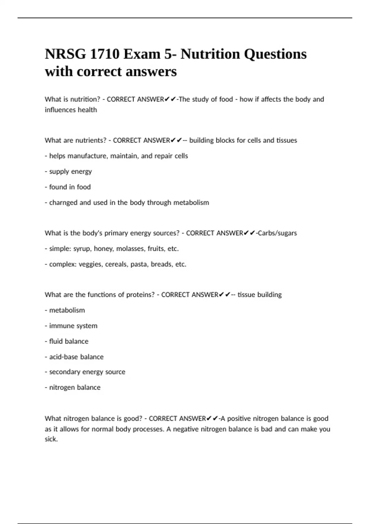 NRSG 1710 Exam 5- Nutrition Questions with correct answers.