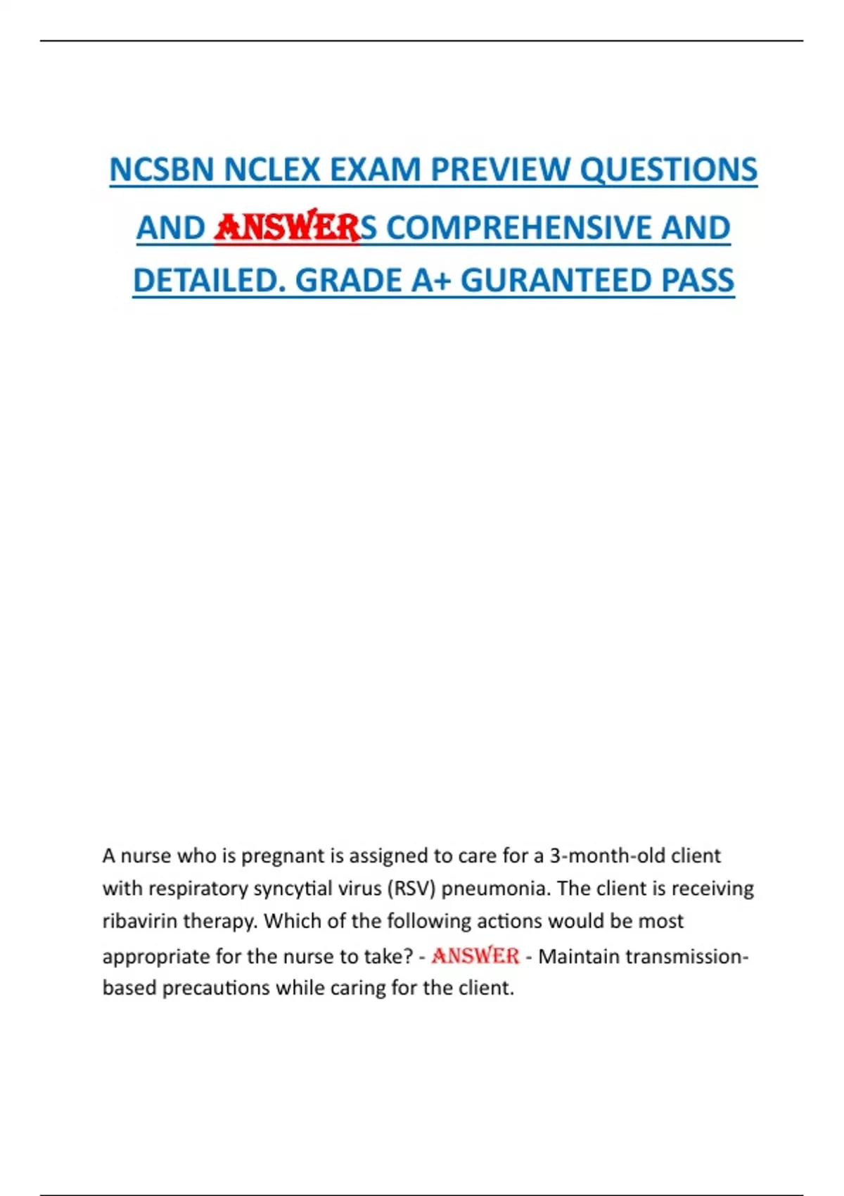 NCSBN NCLEX EXAM PREVIEW QUESTIONS AND ANSWERS COMPREHENSIVE AND DETAILED. GRADE A+ GURANTEED PASS