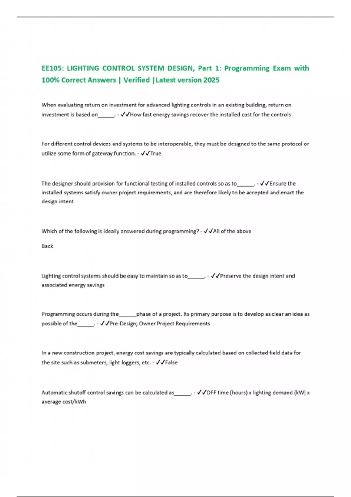 EE105: LIGHTING CONTROL SYSTEM DESIGN, Part 1: Programming Exam with 100% Correct Answers | Verified |Latest version 2025