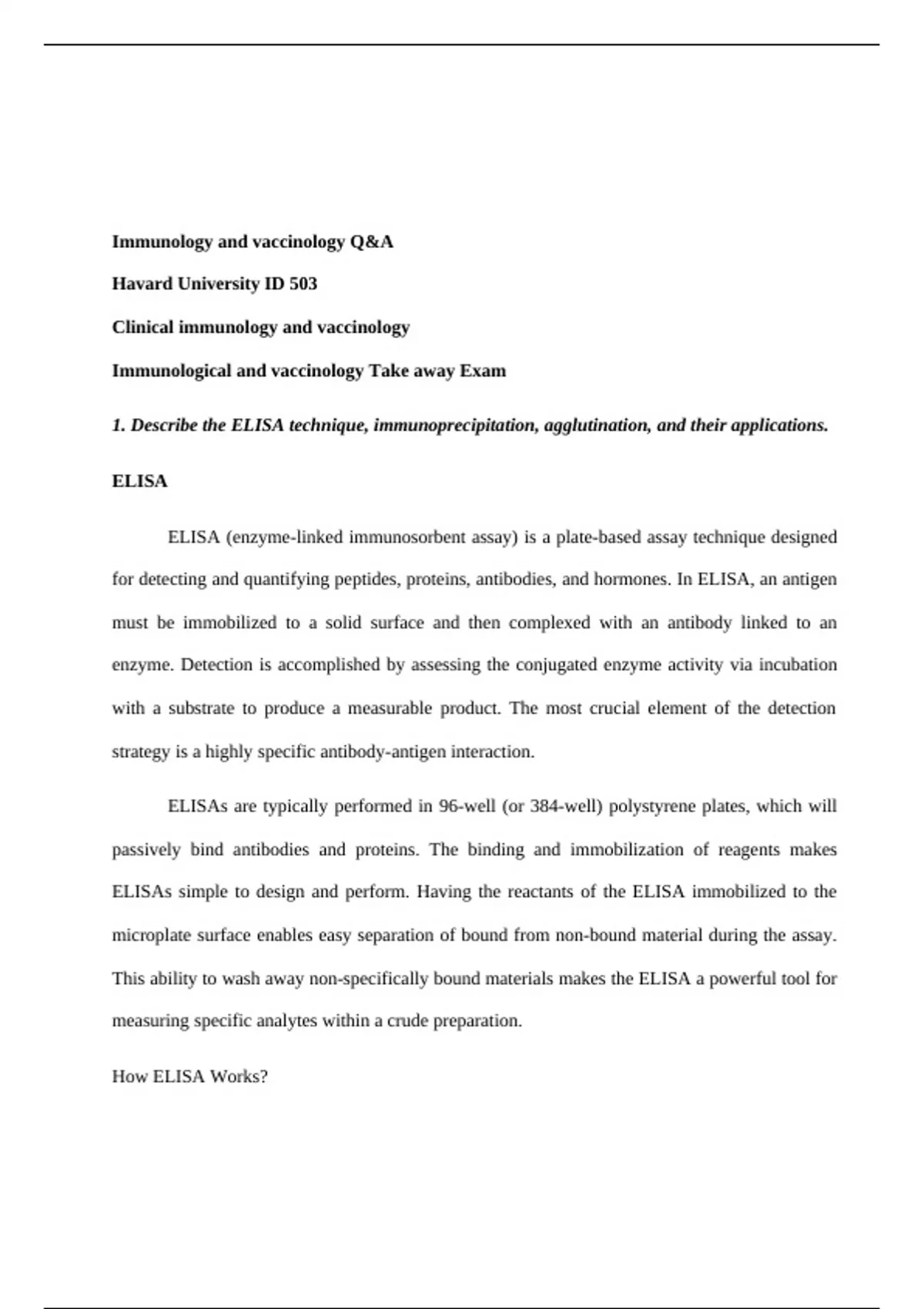 1. Describe the ELISA technique, immunoprecipitation, agglutination, and their applications.