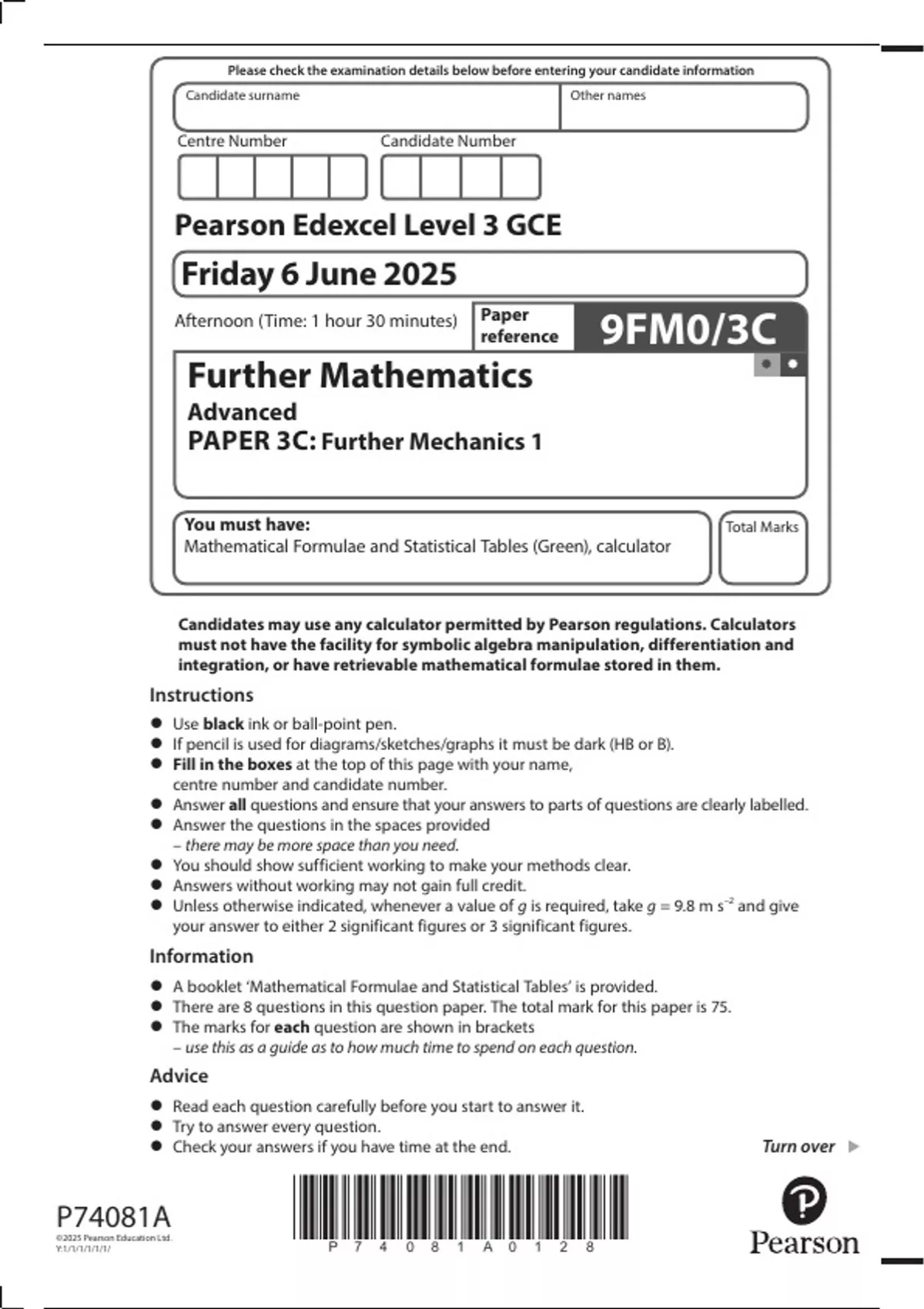 EDEXCEL A LEVEL FM FURTHER MECHANICS PAPER 2025