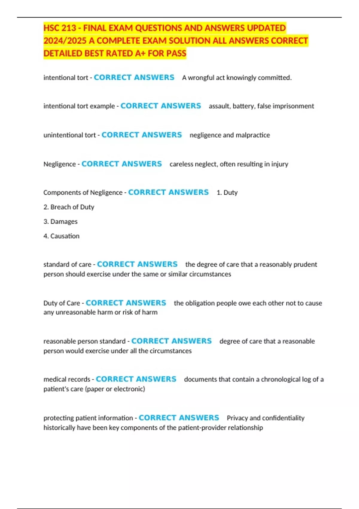 , HSC 213 - FINAL EXAM QUESTIONS AND ANSWERS UPDATED