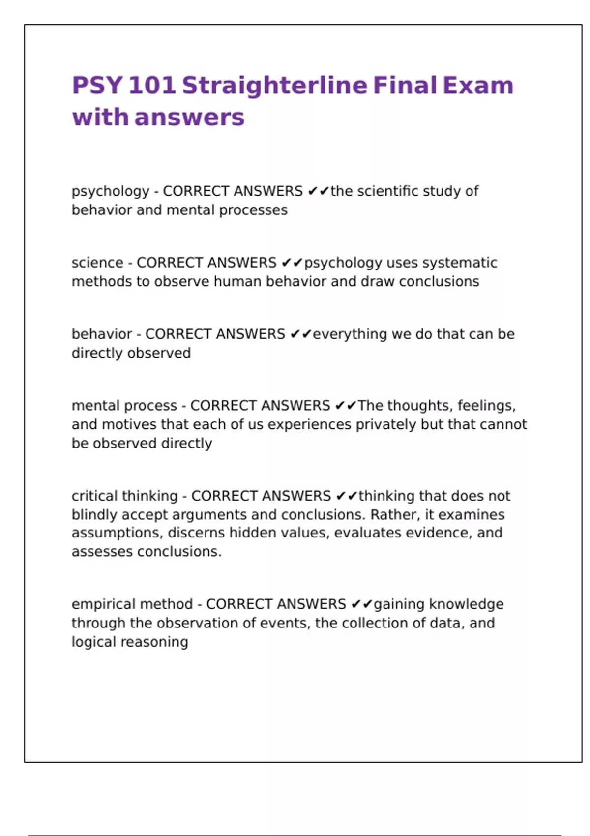 PSY 101 Straighterline Final Exam with answers