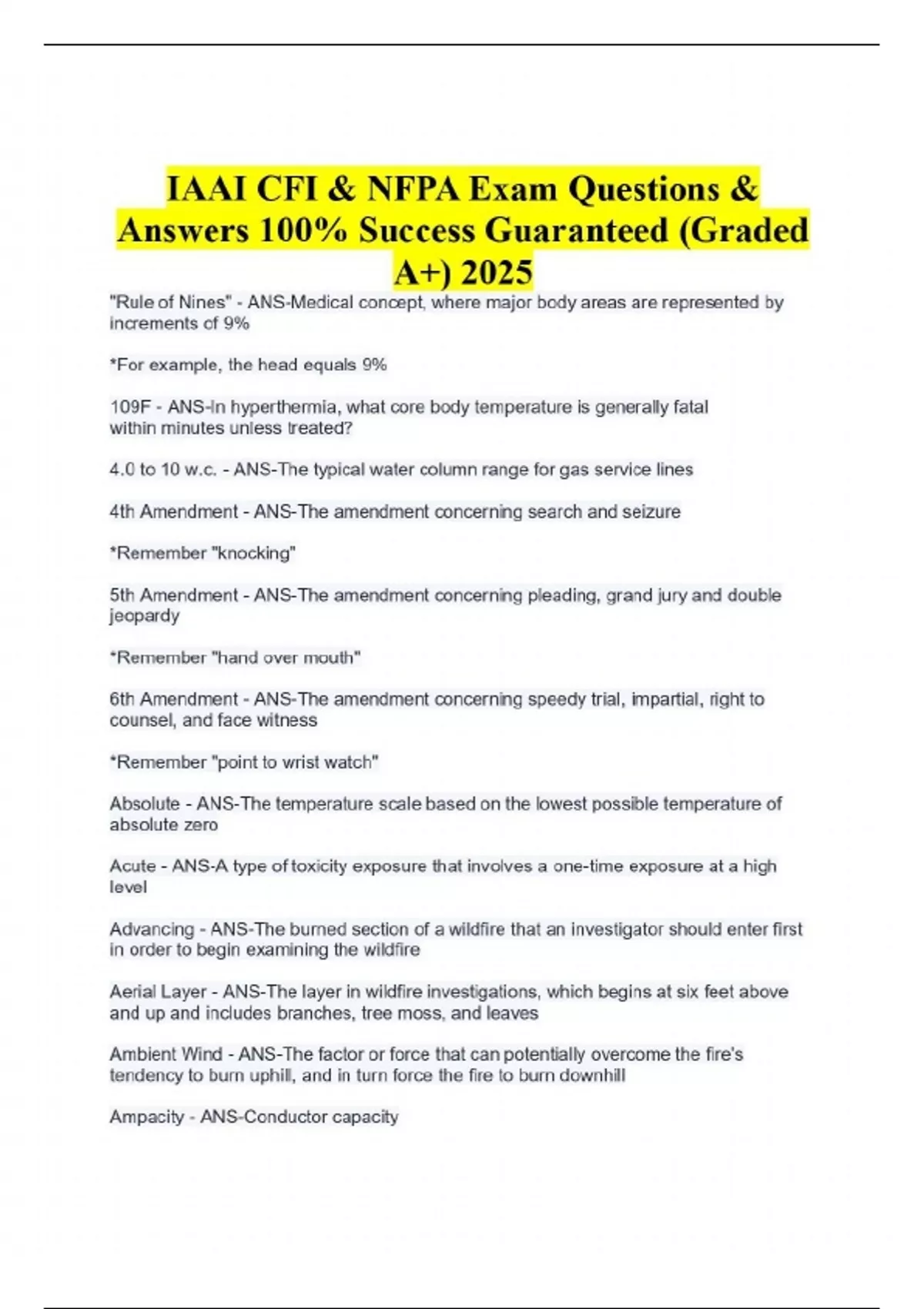 IAAI CFI & NFPA Exam Questions & Answers 100% Success Guaranteed (Graded A+) 2025 "Rule of Nines" - ANS-Medical concept, where major body areas are represented by increments of 9% *For example, the head equals 9% 109F - ANS-In hyperthermia, what core body temperature is generally fatal within minutes unless treated? 4.0 to 10 w.c. - ANS-The typical water column range for gas service lines 4th Amendment - ANS-The amendment concerning search and seizure *Remember "knocking" 5th Amendment - ANS-The amendment concerning pleading, grand jury and double jeopardy *Remember "hand over mouth" 6th Amendment - ANS-The amendment concerning speedy trial, impartial, right to counsel, and face witness *Remember "point to wrist watch" Absolute - ANS-The temperature scale based on the lowest possible temperature of absolute zero Acute - ANS-A type of toxicity exposure that involves a one-time exposure at a high level Advancing - ANS-The burned section of a wildfire that an investigator should enter first in order to begin examining the wildfire Aerial Layer - ANS-The layer in wildfire investigations, which begins at six feet above and up and includes branches, tree moss, and leaves Ambient Wind - ANS-The factor or force that can potentially overcome the fire's tendency to burn uphill, and in turn force the fire to burn downhill Ampacity - ANS-Conductor capacity Ampere - ANS-Unit of electrical current Arc - ANS-Luminous electrical discharge across a gap Arc Mapping - ANS-An electrical analysis that is fundamentally pattern recognition Arcing - ANS-An electrical event that is typically too brief and localized to be a competent ignition source Arson - ANS-From the standpoint of investigative preparation, documentation, and scene control etc., every fire should be approached as if it is potentially what type of fire? Arson Motives - ANS-Vandalism, excitement, revenge, crime concealment, profit, extremism, and pyromania are seven types of what? ASTM E1618 - ANS-What standard governs evidence collection for accelerant testing? Auto-ignition Temperature - ANS-The minimum temperature at which combustible substance ignites without spark or flame Axisymmetric Plume - ANS-A fire plume in the center of the room with no wall interface Backdraft - ANS-A low-order explosion that is the result of an oxygen-depleted fire that produces high concentrations of incomplete combustion products, with a sudden mixture of air into the accumulated fuels Battery - ANS-The only source of electricity in a vehicle when the engine is not running Blast Pressure Front - ANS-The expanding leading edge of explosion reaction, which is primarily responsible for explosion damage and injuries BLEVE - ANS-The most frequently encountered mechanical explosion BLEVE - ANS-An event that occurs when a vessel's contents are liquid and heating causes the liquid to exceed its boiling point and failure of the vessel occurs Rapid Boiling - ANS-This is the mechanism in a Mechanical Explosion, along with the expansion of pressurized gas Bow - ANS-The front of a boat Breaker Panel - ANS-In an electrical system, this device primarily functions as a main cutoff, electrical protection, and power distribution Buoyant Force - ANS-A force that is generated by temperature differences *Due to hot air rising because its less dense Buoyant Force - ANS-Fire plumes, ceiling jets and vent flows are examples of what type of force at work during a fire? Cable Staple - ANS-This structural component cannot be driven through insulation when properly installed 252 Calories & 1055 Joules - ANS-One BTU is equal to ________ calories *Which is equal to _________ Joules Carbon Dioxide - ANS-A type of suppression agent that is effective because it is non-corrosive, residue-less, non-conductive, and universally useful on most combustibles Carbon Monoxide - ANS-Binds with hemoglobin in the blood approximately 250 times greater than oxygen Cascading - ANS-Another name for a secondary or subsequent explosion Catalytic Convertor and Turbocharger - ANS-Name the other two hottest components in a vehicle, other than the exhaust system. Changed or Transferred - ANS-One law of energy says that energy can not be created or destroyed; but can only be what? Chemical Explosion - ANS-Flammable gases, vapors of ignitable liquids, combustible dusts, backdraft explosion, and aerosols are examples of fuels often involved in what type of explosion? Chronic - ANS-A type of toxicity exposure that involves a low-level of continuous exposure Continue...