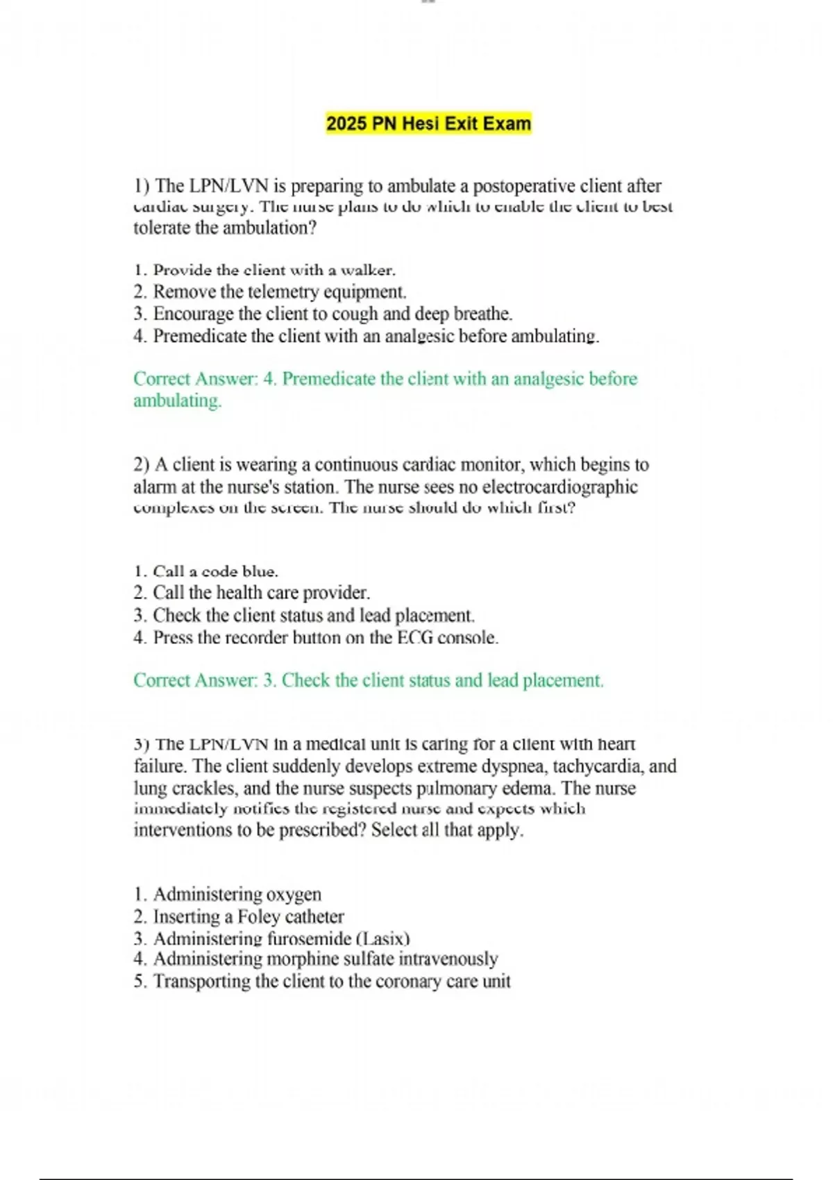 1) The LPN/LVN is preparing to ambulate a postoperative client after cardiac surgery. The nurse plans to do which to enable the client to best tolerate the ambulation? 1. Provide the client with a walker. 2. Remove the telemetry equipment. 3. Encourage the client to cough and deep breathe. 4. Premedicate the client with an analgesic before ambulating. Correct Answer: 4. Premedicate the client with an analgesic before ambulating. 2) A client is wearing a continuous cardiac monitor, which begins to alarm at the nurse's station. The nurse sees no electrocardiographic complexes on the screen. The nurse should do which first? 1. Call a code blue. 2. Call the health care provider. 3. Check the client status and lead placement. 4. Press the recorder button on the ECG console. Correct Answer: 3. Check the client status and lead placement. 3) The LPN/LVN in a medical unit is caring for a client with heart failure. The client suddenly develops extreme dyspnea, tachycardia, and lung crackles, and the nurse suspects pulmonary edema. The nurse immediately notifies the registered nurse and expects which interventions to be prescribed? Select all that apply. 1. Administering oxygen 2. Inserting a Foley catheter 3. Administering furosemide (Lasix) 4. Administering morphine sulfate intravenously 5. Transporting the client to the coronary care unit lOMoAR cPSD| 6. Placing the client in a low-Fowler's side-lying position Correct Answer: 1. Administering oxygen 2. Inserting a Foley catheter 3. Administering furosemide (Lasix) 4) The nurse is monitoring a client following cardioversion. Which observations should be of highest priority to the nurse? 1. Blood pressure 2. Status of airway 3. Oxygen flow rate 4. Level of consciousness Correct Answer: 2. Status of airway 5) The nurse is assisting in caring for the client immediately after insertion of a permanent demand pacemaker via the right subclavian vein. The nurse prevents dislodgement of the pacing catheter by implementing which intervention? 1. Limiting movement and abduction of the left arm 2. Limiting movement and abduction of the right arm 3. Assisting the client to get out of bed and ambulate with a walker 4. Having the physical therapist do active range of motion to the right arm Correct Answer: 2. Limiting movement and abduction of the right arm 6) A client diagnosed with thrombophlebitis 1 day ago suddenly complains of chest pain and shortness of breath, and the client is visibly anxious. The LPN/LVN understands that a life-threatening complication of this condition is which? 1. Pneumonia lOMoAR cPSD| 2. Pulmonary edema 3. Pulmonary embolism 4. Myocardial infarction Correct Answer: 3. Pulmonary embolism 7) A 24-year-old man seeks medical attention for complaints of claudication in the arch of the foot. The nurse also notes superficial thrombophlebitis of the lower leg. The nurse should check the client for which next? 1. Smoking history 2. Recent exposure to allergens 3. History of recent insect bites 4. Familial tendency toward peripheral vascular disease Correct Answer: 1. Smoking history 8) The nurse has reinforced instructions to the client with Raynaud's disease about self-management of the disease process. The nurse determines that the client needs further teaching if the client states which? 1. "Smoking cessation is very important." 2. "Moving to a warmer climate should help." 3. "Sources of caffeine should be eliminated from the diet." 4. "Taking nifedipine (Procardia) as prescribed will decrease vessel spasm." Correct Answer: 2. "Moving to a warmer climate should help." 9) A client with myocardial infarction suddenly becomes tachycardic, shows signs of air hunger, and begins coughing frothy, pink-tinged sputum. The nurse listens to breath sounds, expecting to hear which breath sounds bilaterally? lOMoAR cPSD| 1. Rhonchi 2. Crackles 3. Wheezes 4. Diminished breath sounds Correct Answer: 2. Crackles 10) The LPN/LVN is collecting data on a client with a diagnosis of right- sided heart failure. The nurse should expect to note which specific characteristic of this condition? 1. Dyspnea 2. Hacking cough 3. Dependent edema 4. Crackles on lung auscultation Correct Answer: 3. Dependent edema 11) The LPN/LVN is checking the neurovascular status of a client who returned to the surgical nursing unit 4 hours ago after undergoing an aortoiliac bypass graft. The affected leg is warm, and the nurse notes redness and edema. The pedal pulse is palpable and unchanged from admission. The nurse interprets that the neurovascular status is which? 1. Moderately impaired, and the surgeon should be called 2. Normal, caused by increased blood flow through the leg 3. Slightly deteriorating, and should be monitored for another hour 4. Adequate from an arterial approach, but venous complications are arising Correct Answer: 2. Normal, caused by increased blood flow through the leg 12) A client with a diagnosis of rapid rate atrial fibrillation asks the nurse why the health care provider is going to perform carotid massage. The LPN/LVN responds that this procedure may stimulate which? lOMoAR cPSD| 1. Vagus nerve to slow the heart rate 2. Vagus nerve to increase the heart rate 3. Diaphragmatic nerve to slow the heart rate 4. Diaphragmatic nerve to increase the heart rate Correct Answer: 1. Vagus nerve to slow the heart rate 13) A client is admitted to the hospital with possible rheumatic endocarditis. The LPN/LVN should check for a history of which type of infection? 1. Viral infection 2. Yeast infection 3. Streptococcal infection 4. Staphylococcal infection Correct Answer: 3. Streptococcal infection 14) A client has an Unna boot applied for treatment of a venous stasis leg ulcer. The LPN/LVN notes that the client's toes are mottled, and cool and the client verbalizes some numbness and tingling of the foot. Which interpretation should the nurse make of these findings? 1. The boot has not yet dried. 2. The boot is controlling leg edema. 3. The boot is impairing venous retu