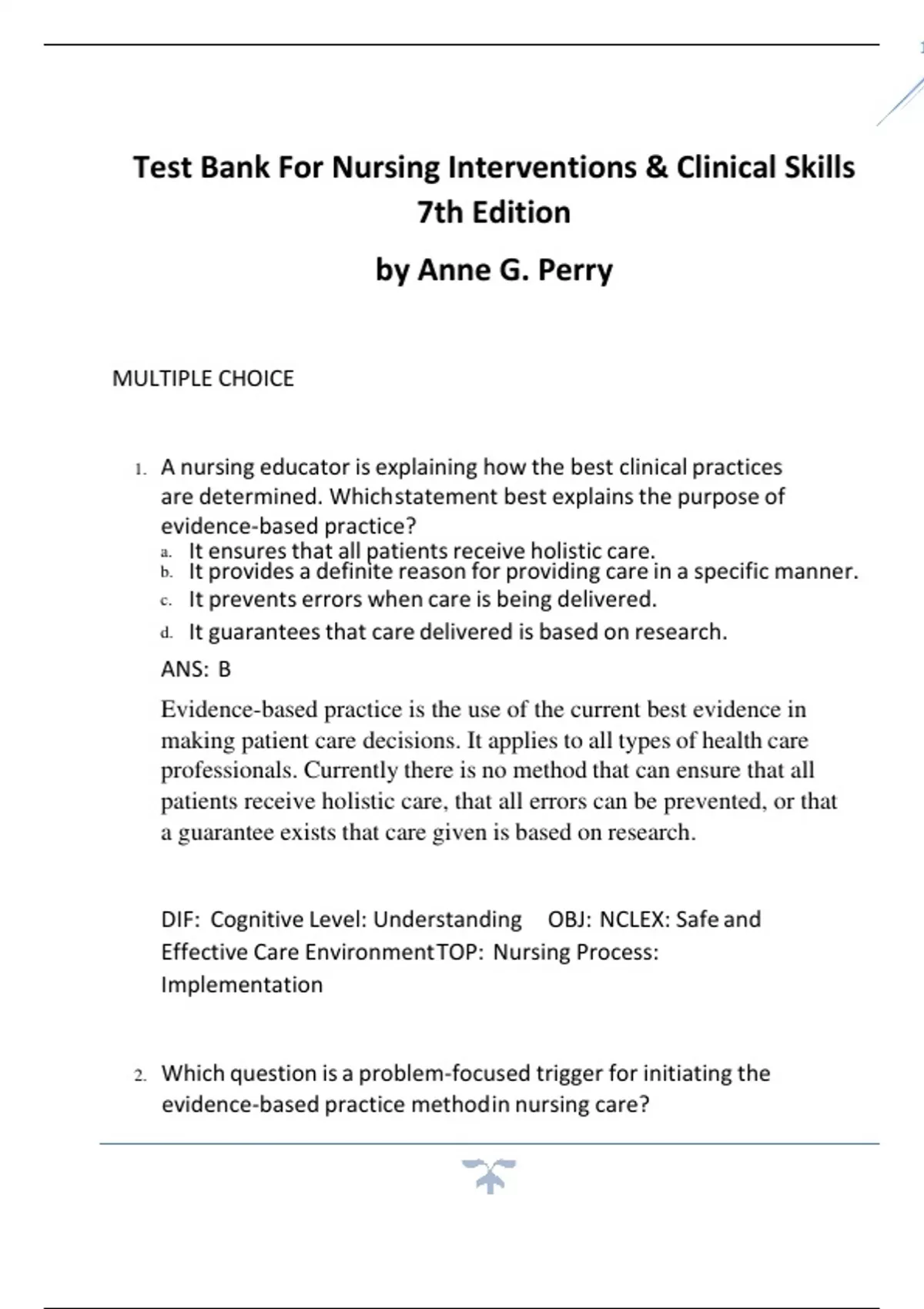 Test Bank for Nursing Interventions & Clinical Skills 7th Edition by Anne G. Perry - (2025/2026) (All Chapters Covered) (Complete Guide with Answers) (Graded A+)