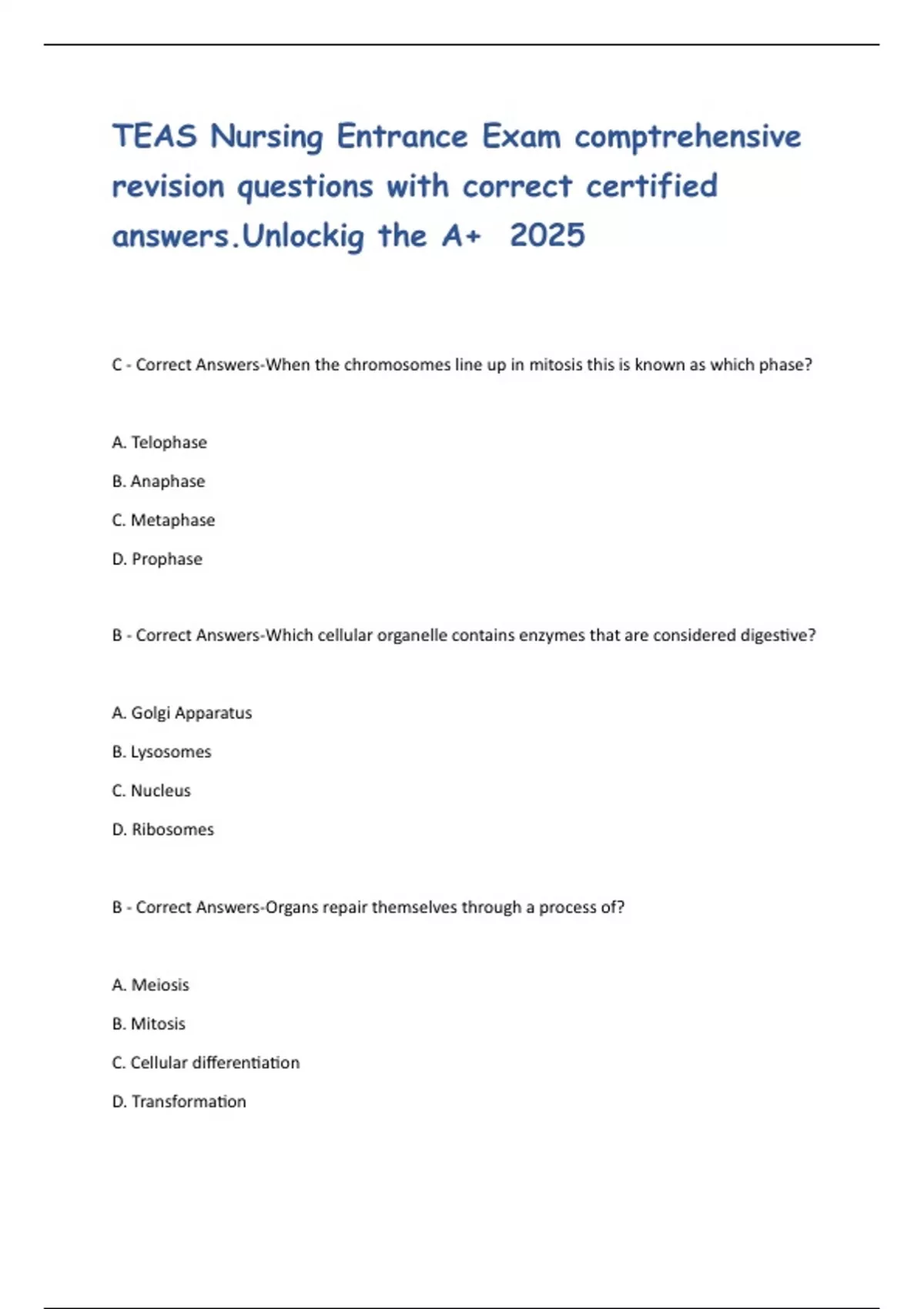 C - Correct Answers-When the chromosomes line up in mitosis this is known as which phase?