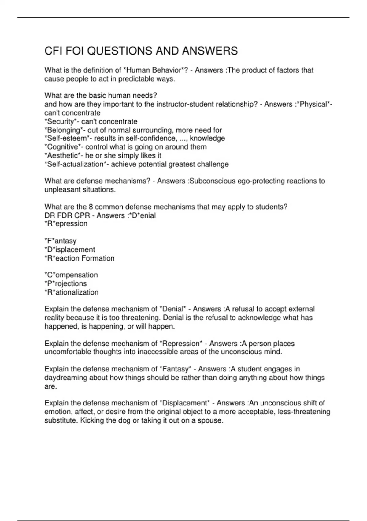 , Explain the defense mechanism of *Reaction Formation* - Answers :Faking a belief