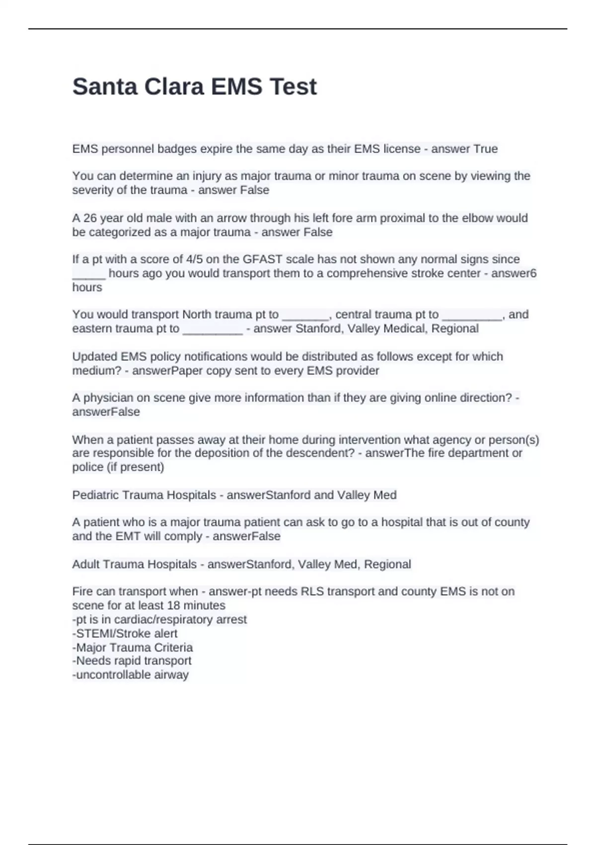 Santa Clara EMS Test Questions and Answers 100% Correct