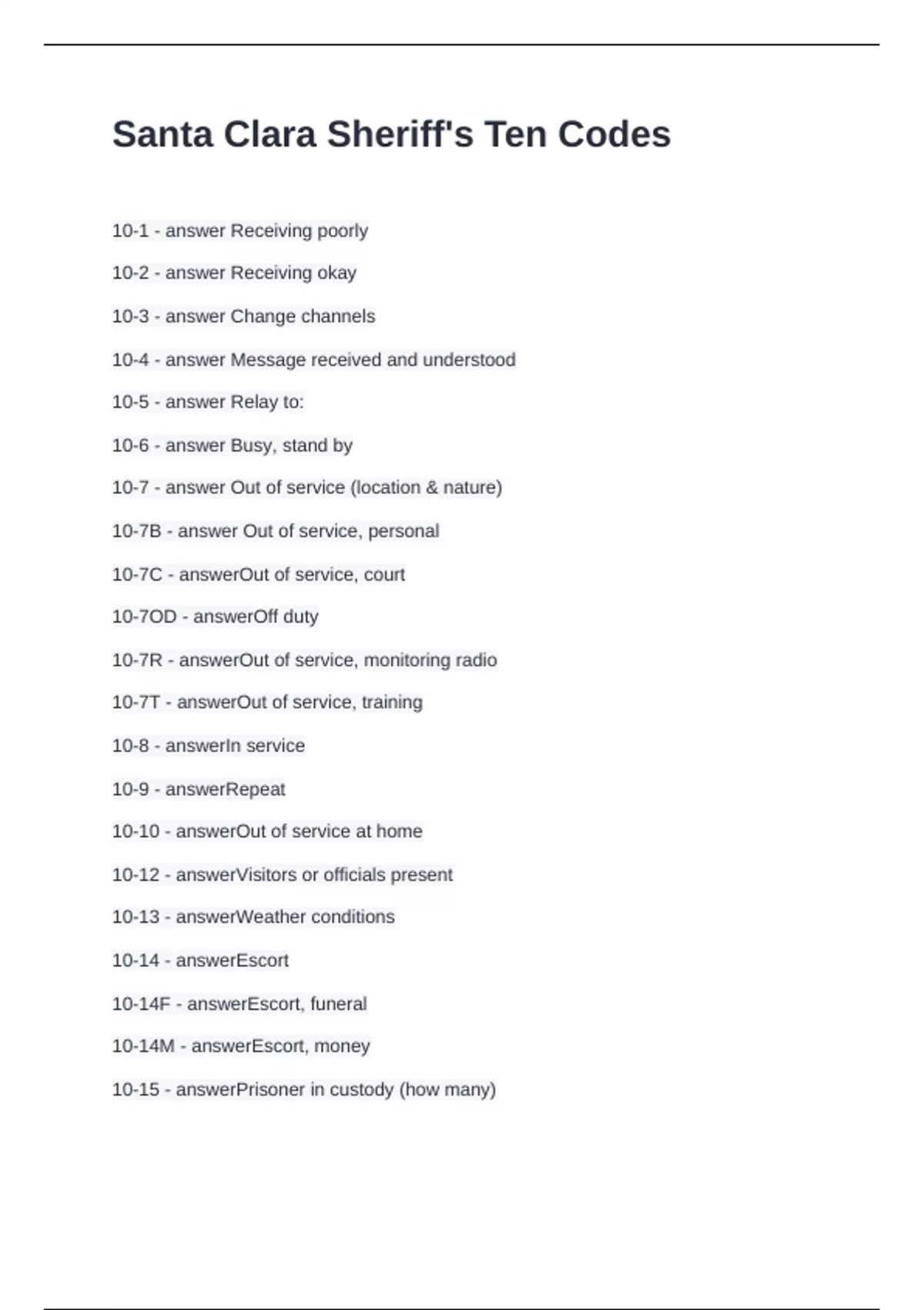 Santa Clara Sheriff's Ten Codes