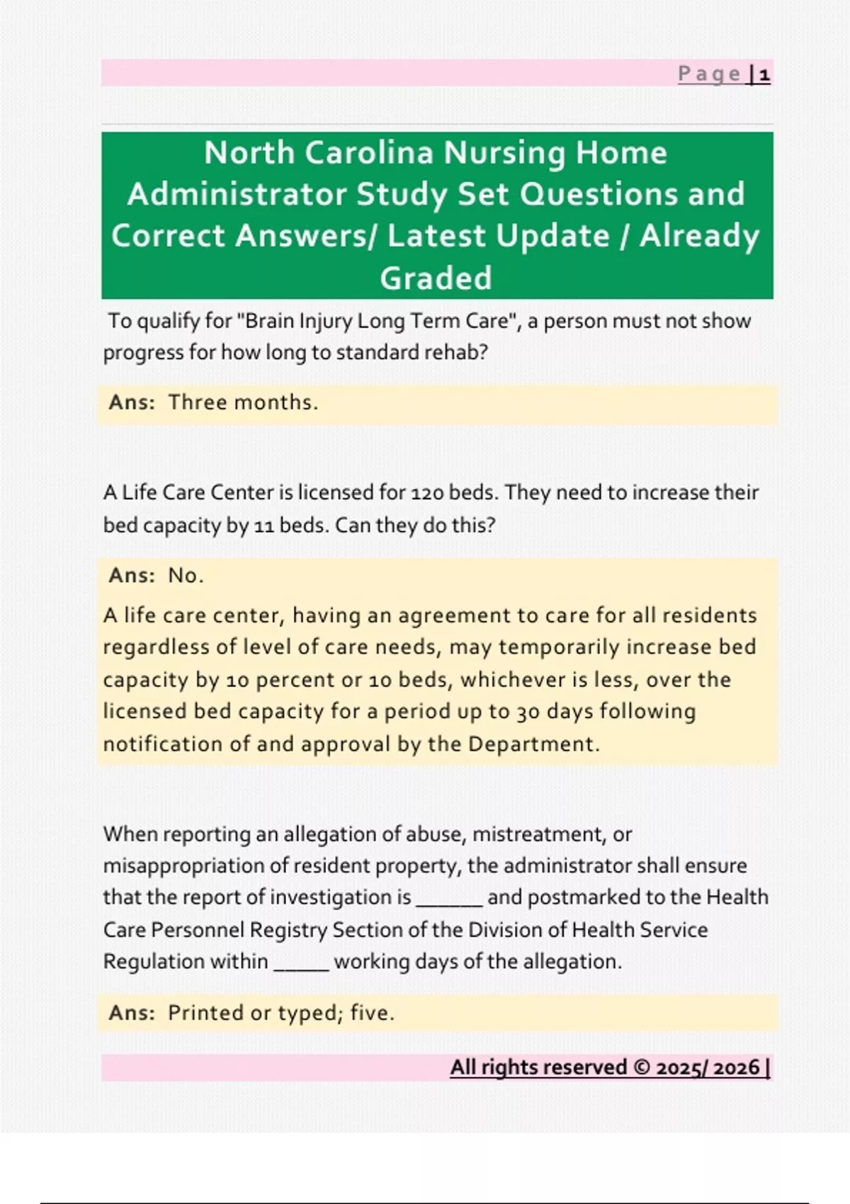 North Carolina Nursing Home Administrator Study Set Questions and Correct Answers/ Latest Update / Already Graded
