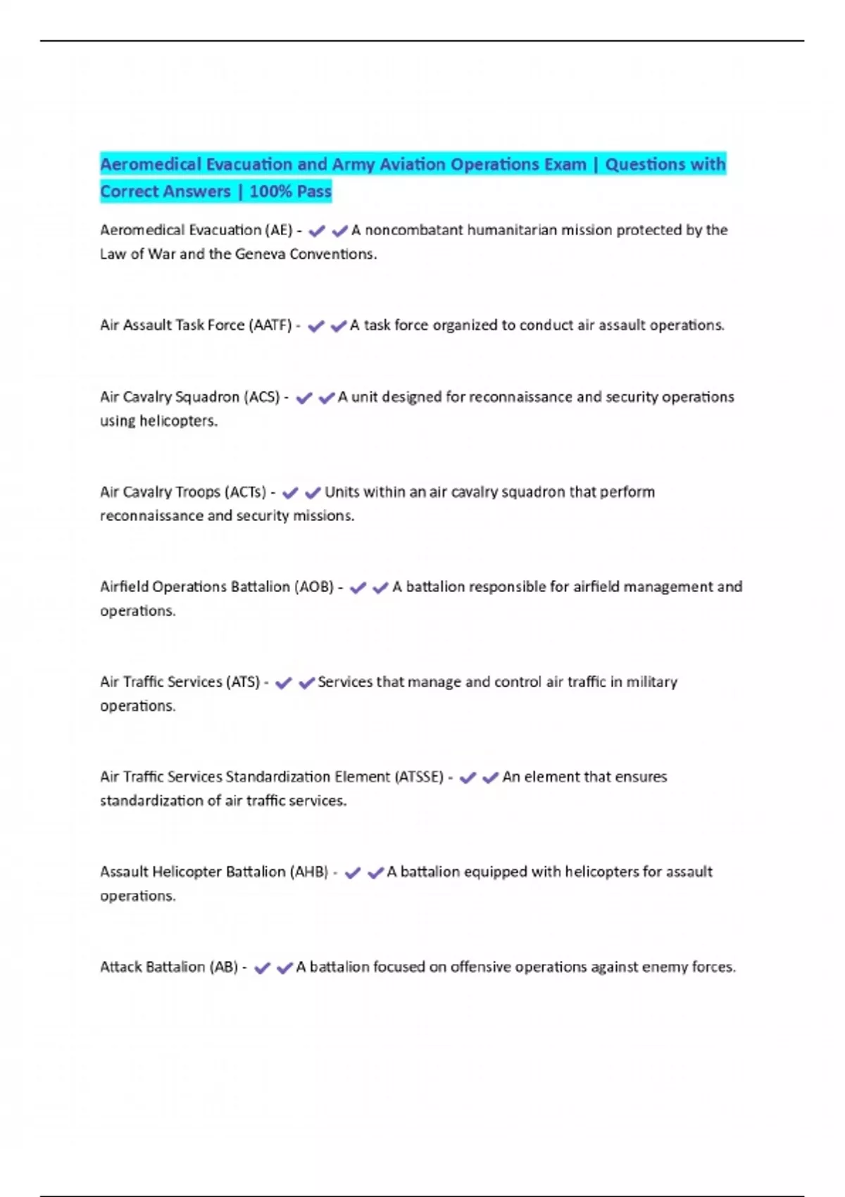 Aeromedical Evacuation and Army Aviation Operations Exam | Questions with Correct Answers | 100% Pass