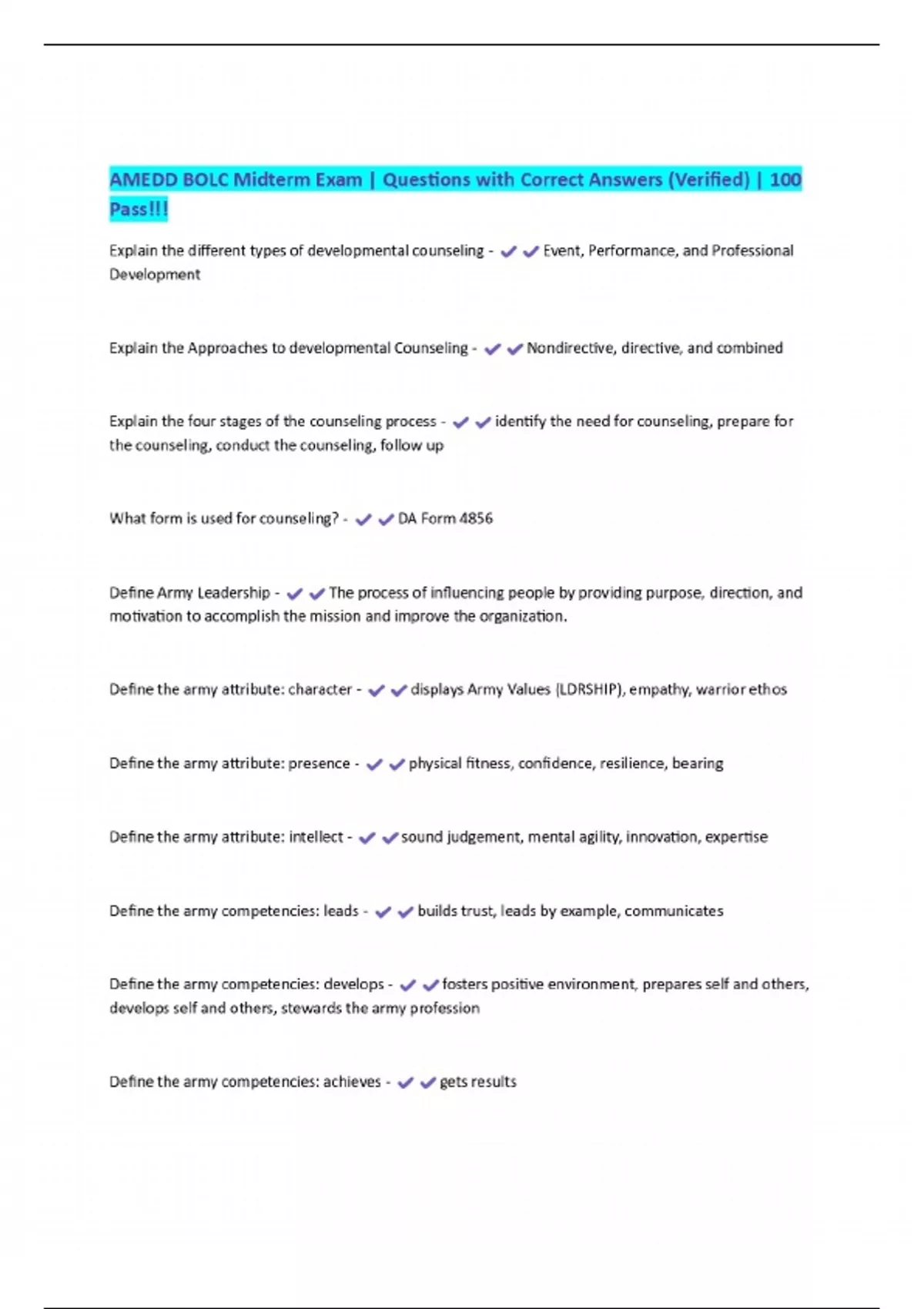 AMEDD BOLC Midterm Exam | Questions with Correct Answers (Verified) | 100 Pass!!!