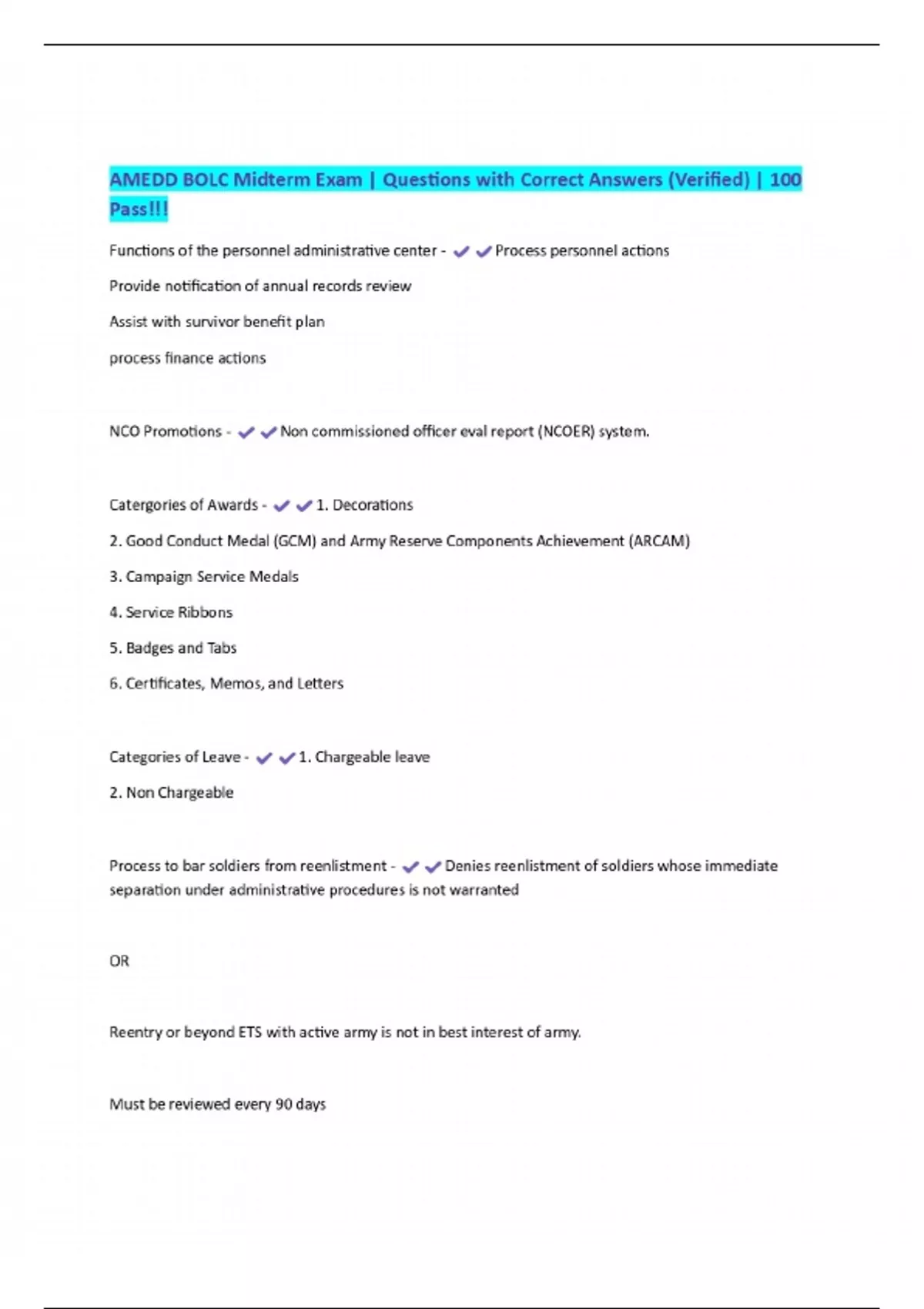 AMEDD BOLC Midterm Exam | Questions with Correct Answers (Verified) | 100 Pass!!!