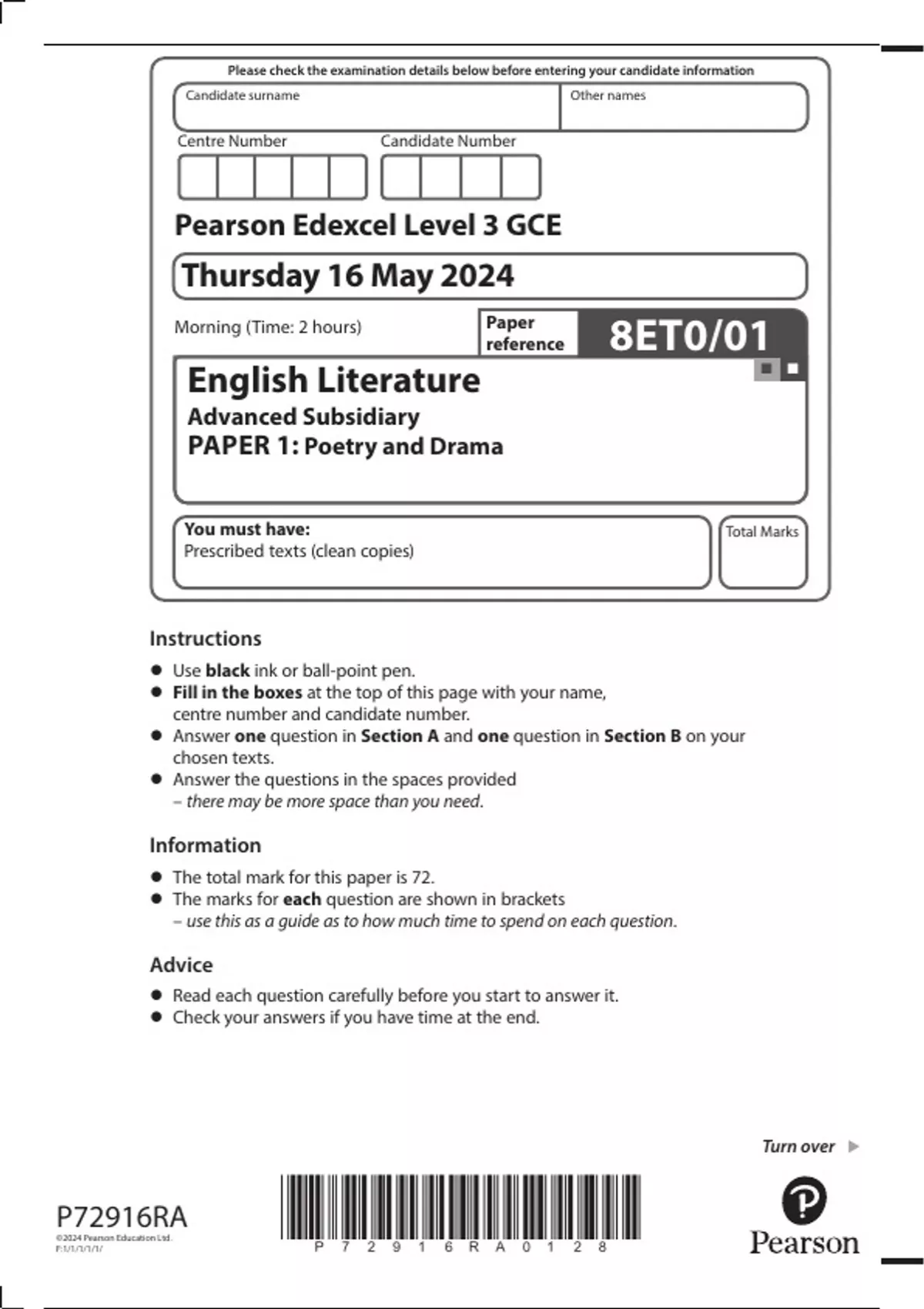 Pearson Edexcel Level 3 GCE English Literature Advanced Subsidiary PAPER 1: Poetry and Drama 8ET0/01 question paper june 2024