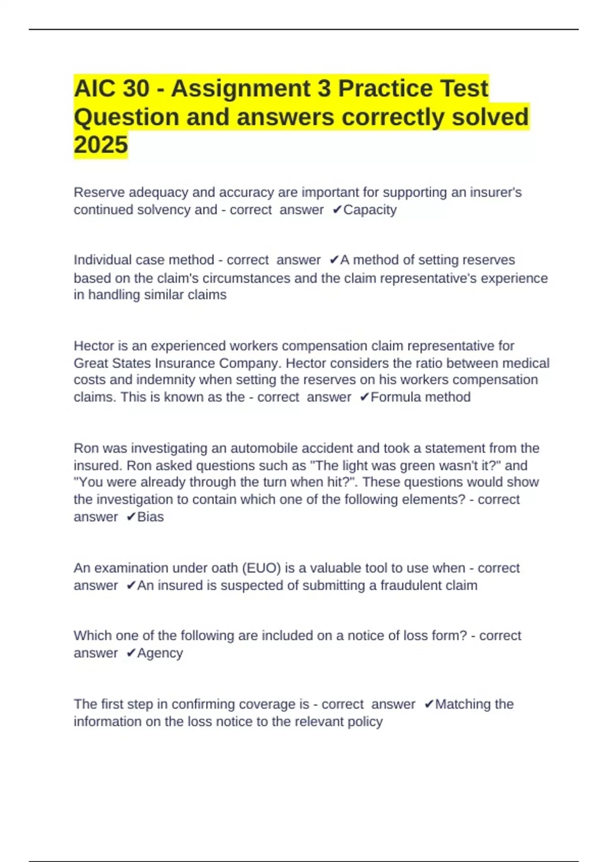 AIC 30 - Assignment 3 Practice Test Question and answers correctly solved 2025 Reserve adequacy and accuracy are important for supporting an insurer's continued solvency and - correct answer Capacity Individual case method - correct answer A method of setting reserves based on the claim's circumstances and the claim representative's experience in handling similar claims Hector is an experienced workers compensation claim representative for Great States Insurance Company. Hector considers the ratio between medical costs and indemnity when setting the reserves on his workers compensation claims. This is known as the - correct answer Formula method Ron was investigating an automobile accident and took a statement from the insured. Ron asked questions such as "The light was green wasn't it?" and "You were already through the turn when hit?". These questions would show the investigation to contain which one of the following elements? - correct answer Bias An examination under oath (EUO) is a valuable tool to use when - correct answer An insured is suspected of submitting a fraudulent claim