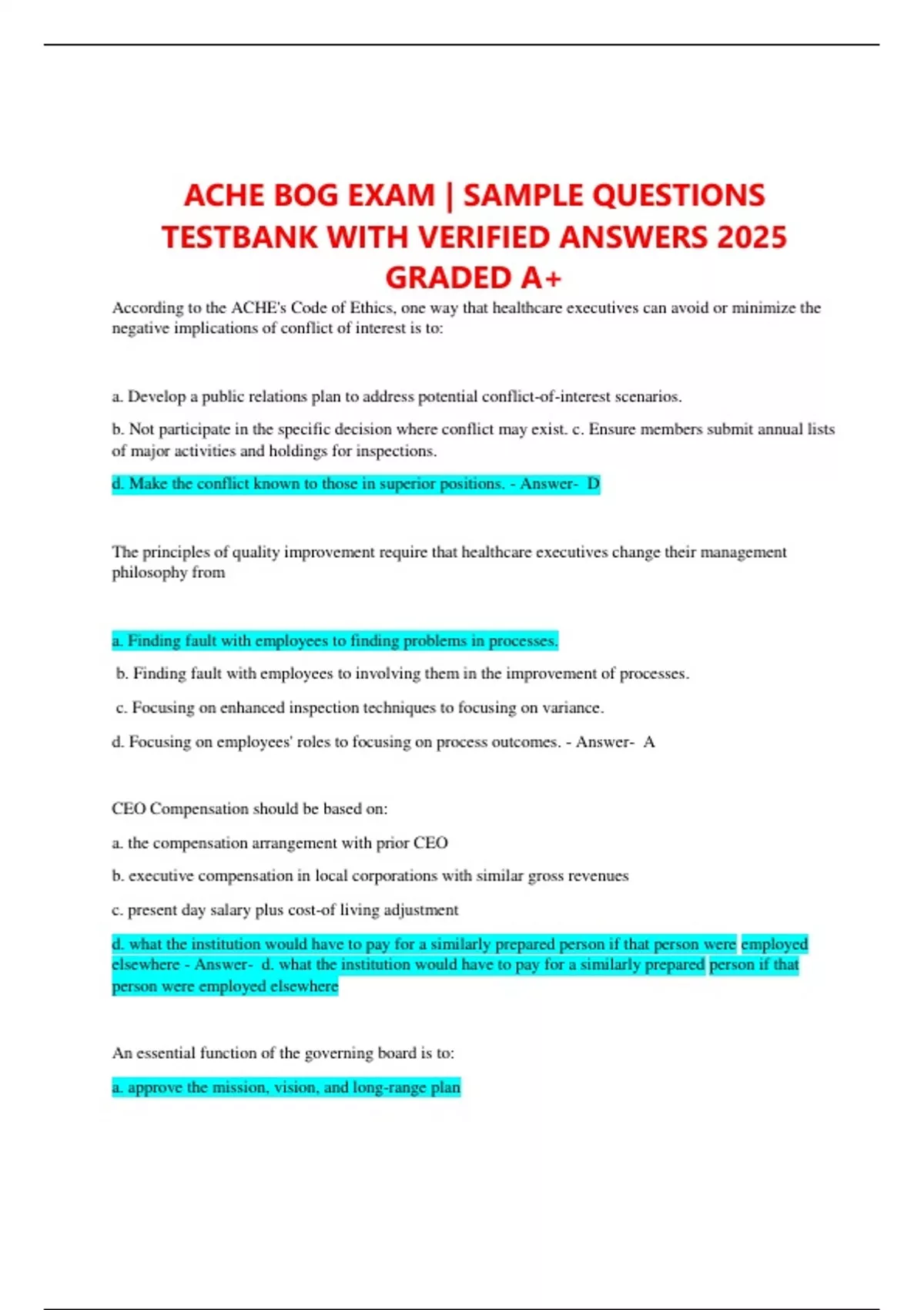 ACHE BOG EXAM | SAMPLE QUESTIONS TESTBANK WITH VERIFIED ANSWERS 2025 GRADED A+