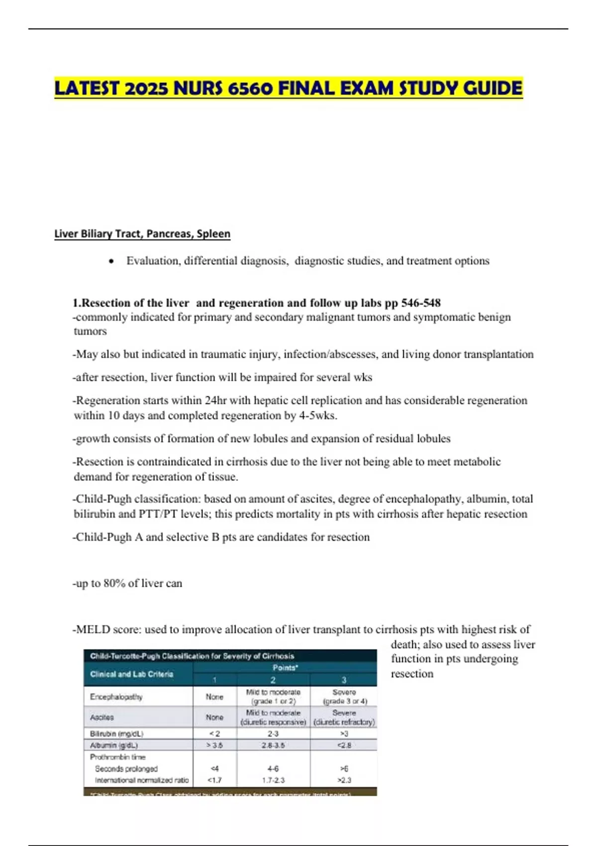 LATEST 2025 NURS 6560 FINAL EXAM STUDY GUIDE Liver Biliary Tract, Pancreas, Spleen • Evaluation, differential diagnosis, diagnostic studies, and treatment options 1.Resection of the liver and regeneration and follow up labs pp 546-548 -commonly indicated for primary and secondary malignant tumors and symptomatic benign tumors -May also but indicated in traumatic injury, infection/abscesses, and living donor transplantation -after resection, liver function will be impaired for several wks -Regeneration starts within 24hr with hepatic cell replication and has considerable regeneration within 10 days and completed regeneration by 4-5wks. -growth consists of formation of new lobules and expansion of residual lobules -Resection is contraindicated in cirrhosis due to the liver not being able to meet metabolic demand for regeneration of tissue. -Child-Pugh classification: based on amount of ascites, degree of encephalopathy, albumin, total bilirubin and PTT/PT levels; this predicts mortality in pts with cirrhosis after hepatic resection -Child-Pugh A and selective B pts are candidates for resection