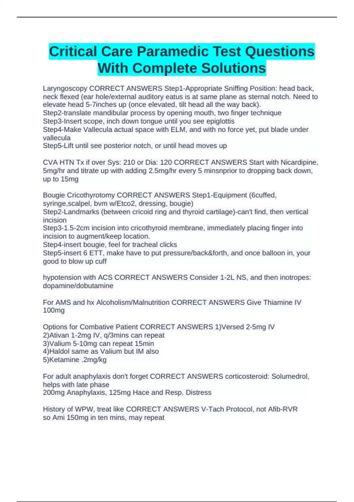 Laryngoscopy CORRECT ANSWERS Step1-Appropriate Sniffing Position: head back,