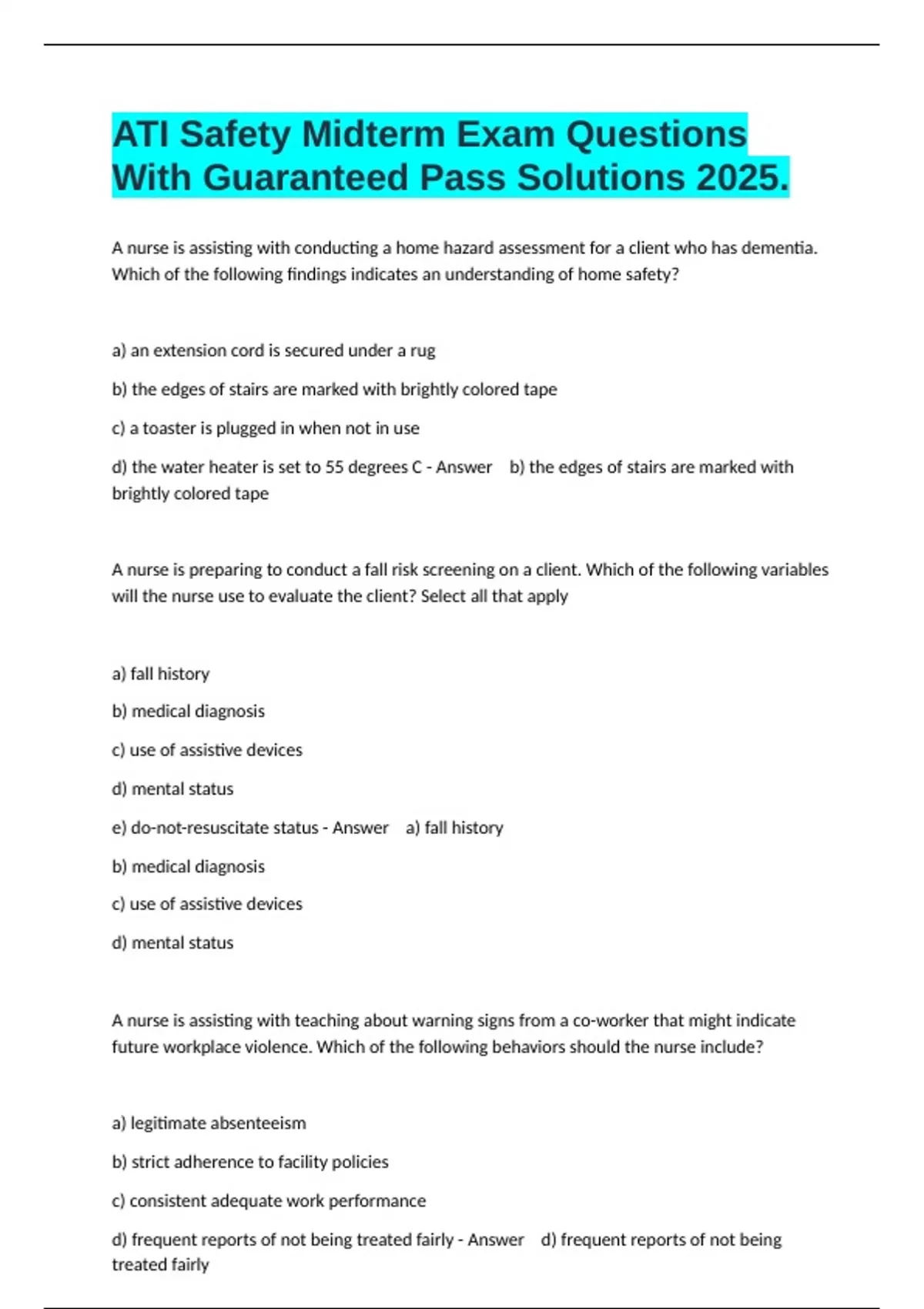 A nurse is assisting with conducting a home hazard assessment for a client who has dementia. Which of the following findings indicates an understanding of home safety? a) an extension cord is secured under a rug b) the edges of stairs are marked with brightly colored tape c) a toaster is plugged in when not in use d) the water heater is set to 55 degrees C - Answer b) the edges of stairs are marked with brightly colored tape A nurse is preparing to conduct a fall risk screening on a client. Which of the following variables will the nurse use to evaluate the client? Select all that apply a) fall history b) medical diagnosis c) use of assistive devices d) mental status e) do-not-resuscitate status - Answer a) fall history b) medical diagnosis c) use of assistive devices d) mental status A nurse is assisting with teaching about warning signs from a co-worker that might indicate future workplace violence. Which of the following behaviors should the nurse include? a) legitimate absenteeism b) strict adherence to facility policies c) consistent adequate work performance d) frequent reports of not being treated fairly - Answer d) frequent reports of not being treated fairly A nurse is caring for a client who has a prescription for wrist restraints. Which of the following actions should the nurse take?