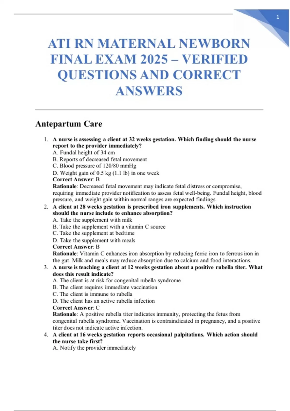 1. A nurse is assessing a client at 32 weeks gestation. Which finding should the nurse