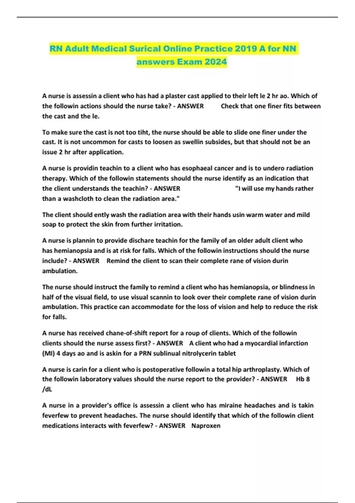 RN Adult Medical Surgical Online Practice 2019 A for NGN answers Exam 2024