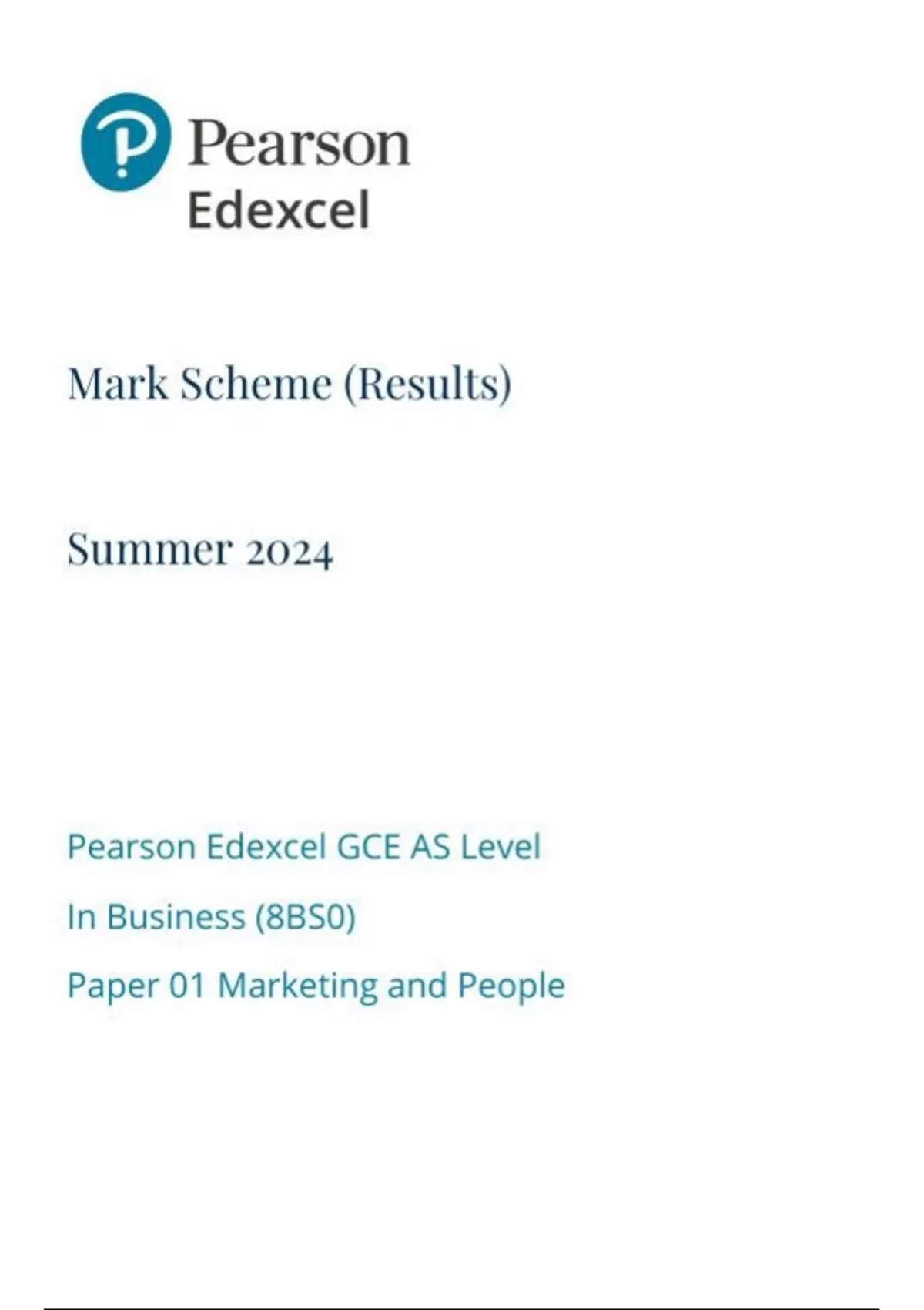 Pearson Edexcel GCE AS Level In Business (8BS0) Paper 01 Marketing and People mark scheme june 2024 8bs0-01