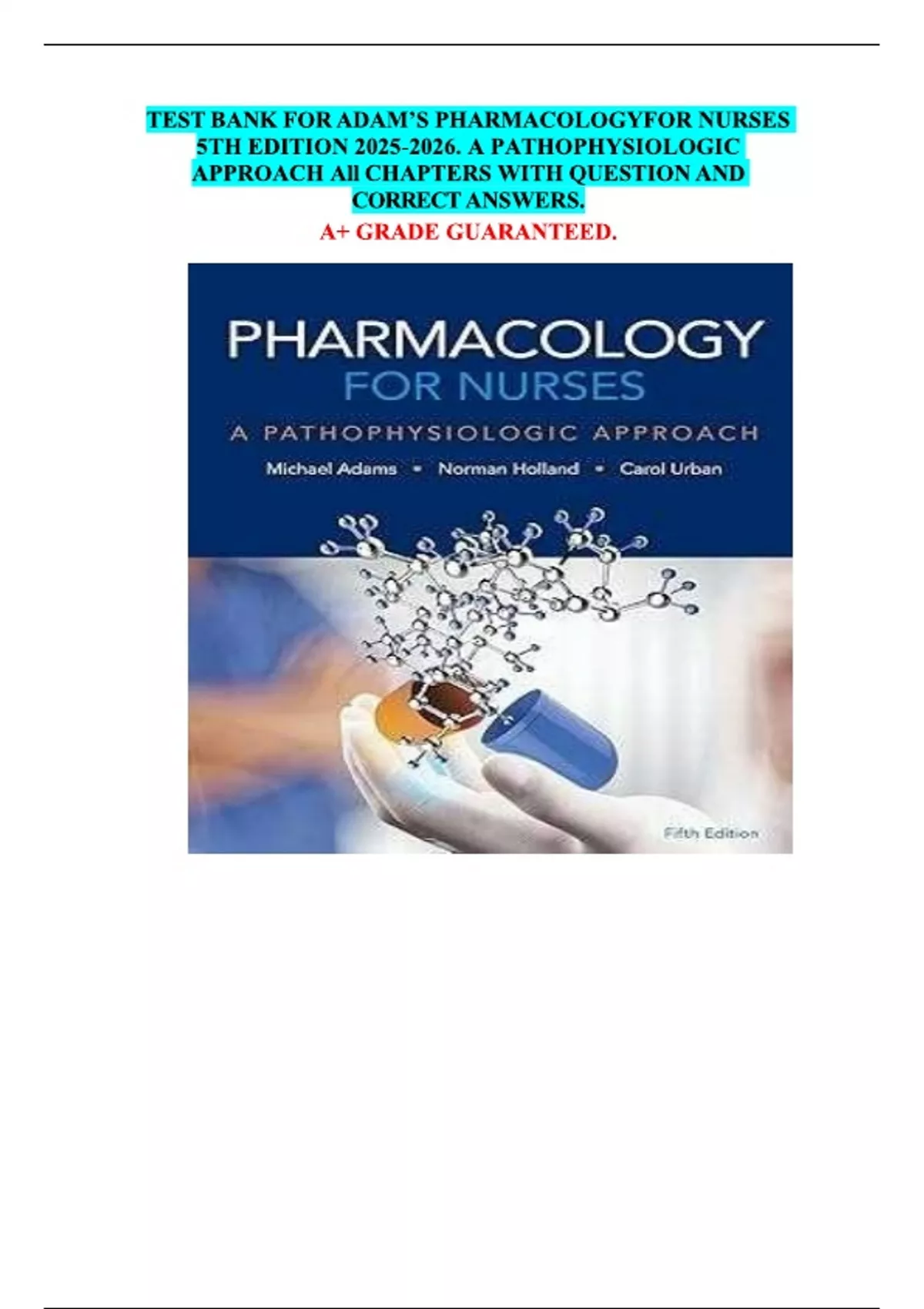 TEST BANK FOR ADAM’S PHARMACOLOGY FOR NURSES A PATHOPHYSIOLOGIC APPROACH, 7TH EDITION . QUESTIONS WITH CORRECT AND VERIFIED ANSWERS. GUARANTEED A+ GRADED.