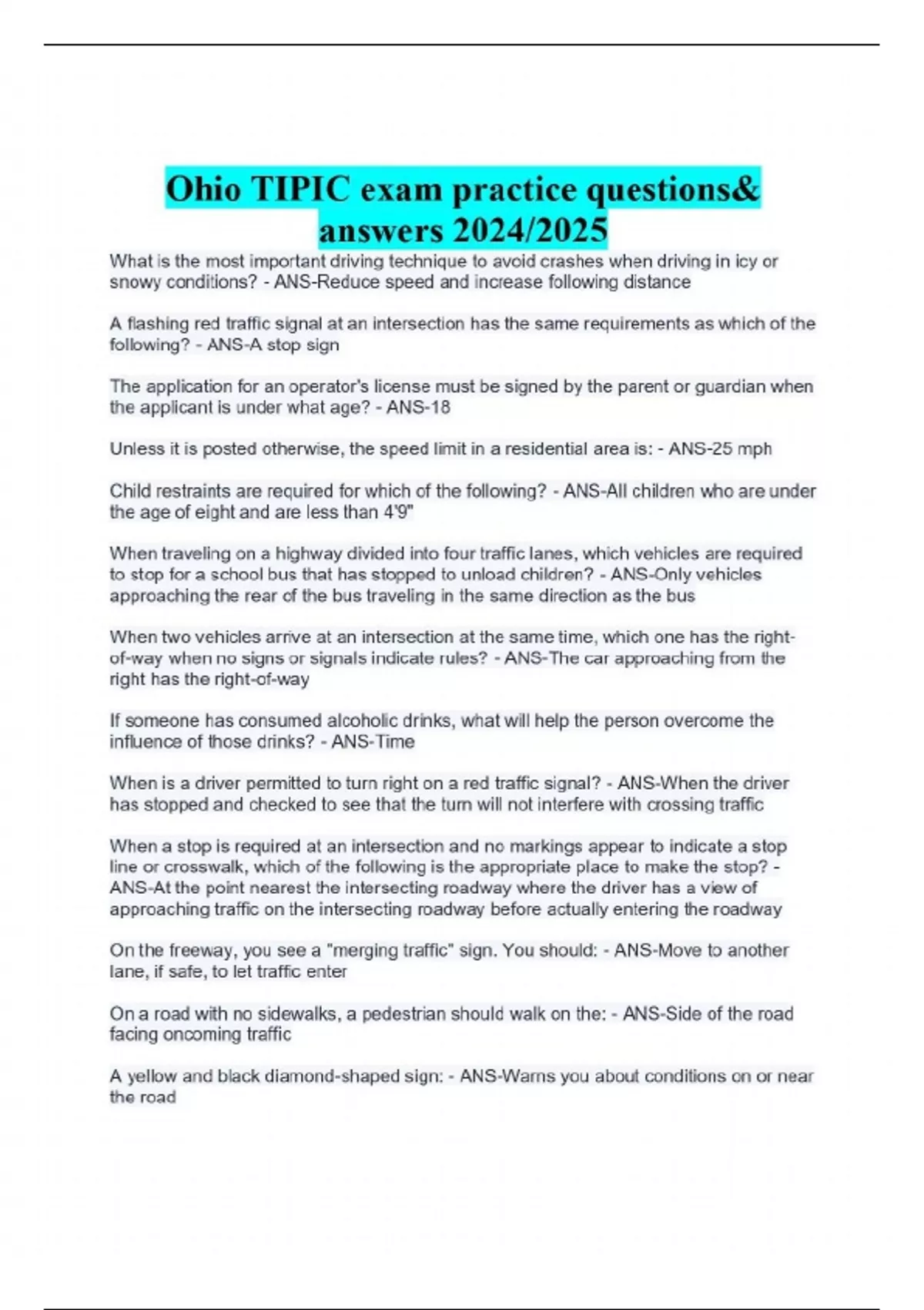 Ohio TIPIC exam practice questions& answers 2024/2025 What is the most important driving technique to avoid crashes when driving in icy or snowy conditions? - ANS-Reduce speed and increase following distance A flashing red traffic signal at an intersection has the same requirements as which of the following? - ANS-A stop sign The application for an operator's license must be signed by the parent or guardian when the applicant is under what age? - ANS-18 Unless it is posted otherwise, the speed limit in a residential area is: - ANS-25 mph Child restraints are required for which of the following? - ANS-All children who are under the age of eight and are less than 4'9" When traveling on a highway divided into four traffic lanes, which vehicles are required to stop for a school bus that has stopped to unload children? - ANS-Only vehicles approaching the rear of the bus traveling in the same direction as the bus When two vehicles arrive at an intersection at the same time, which one has the right-of-way when no signs or signals indicate rules? - ANS-The car approaching from the right has the right-of-way If someone has consumed alcoholic drinks, what will help the person overcome the influence of those drinks? - ANS-Time When is a driver permitted to turn right on a red traffic signal? - ANS-When the driver has stopped and checked to see that the turn will not interfere with crossing traffic When a stop is required at an intersection and no markings appear to indicate a stop line or crosswalk, which of the following is the appropriate place to make the stop? - ANS-At the point nearest the intersecting roadway where the driver has a view of approaching traffic on the intersecting roadway before actually entering the roadway On the freeway, you see a "merging traffic" sign. You should: - ANS-Move to another lane, if safe, to let traffic enter On a road with no sidewalks, a pedestrian should walk on the: - ANS-Side of the road facing oncoming traffic A yellow and black diamond-shaped sign: - ANS-Warns you about conditions on or near the road A broken yellow line alongside a solid yellow line means: - ANS-Passing is permitted from the lane nest to the broken line You want to back out of your driveway. You see children playing nearby. Before you start to move your car, you should: - ANS-Walk to the back of the car to be sure the way is clear Certain highway signs require drivers to obey an indicated instruction. Such signs are known as: - ANS-Information signs A leaky exhaust system in your vehicle is dangerous because it can cause: - ANS-Carbon monoxide poisoning When entering a street from a driveway, you: - ANS-Must stop and proceed only when there are no pedestrians or vehicles approaching Guide signs are _____ signs that provide directional and mileage information to drivers - ANS-Green When approaching a traffic signal displaying a flashing yellow arrow, drivers: - ANS-May turn left after yielding to oncoming traffic and pedestrians A single broken yellow line down the center of a two-lane road indicates: - ANS-Lanes are moving in opposite directions and drivers are permitted to pass when it is safe to do so Unless otherwise posted, the speed limit on freeways with paved shoulders is: - ANS-65 mph When traveling on a multi lane roadway with traffic moving in opposite directions, how should drivers use the shared center lane? - ANS-To slow down or stop before turning left Fog can greatly reduce the visibility of other vehicles, pedestrians, and traffic signals. When driving in fog, you should: - ANS-Drive cautiously and reduce your speed, not use your high beam headlights, and use low beam headlights to better illuminate the road and objects A single broken white line down the center of a two-lane road indicates: - ANS-Lanes are moving in the same direction and drivers are permitted to pass when it is safe to do so The driver's left arm and hand are extended downward. This hand signal means that the driver plans to: - ANS-Stop Continues...