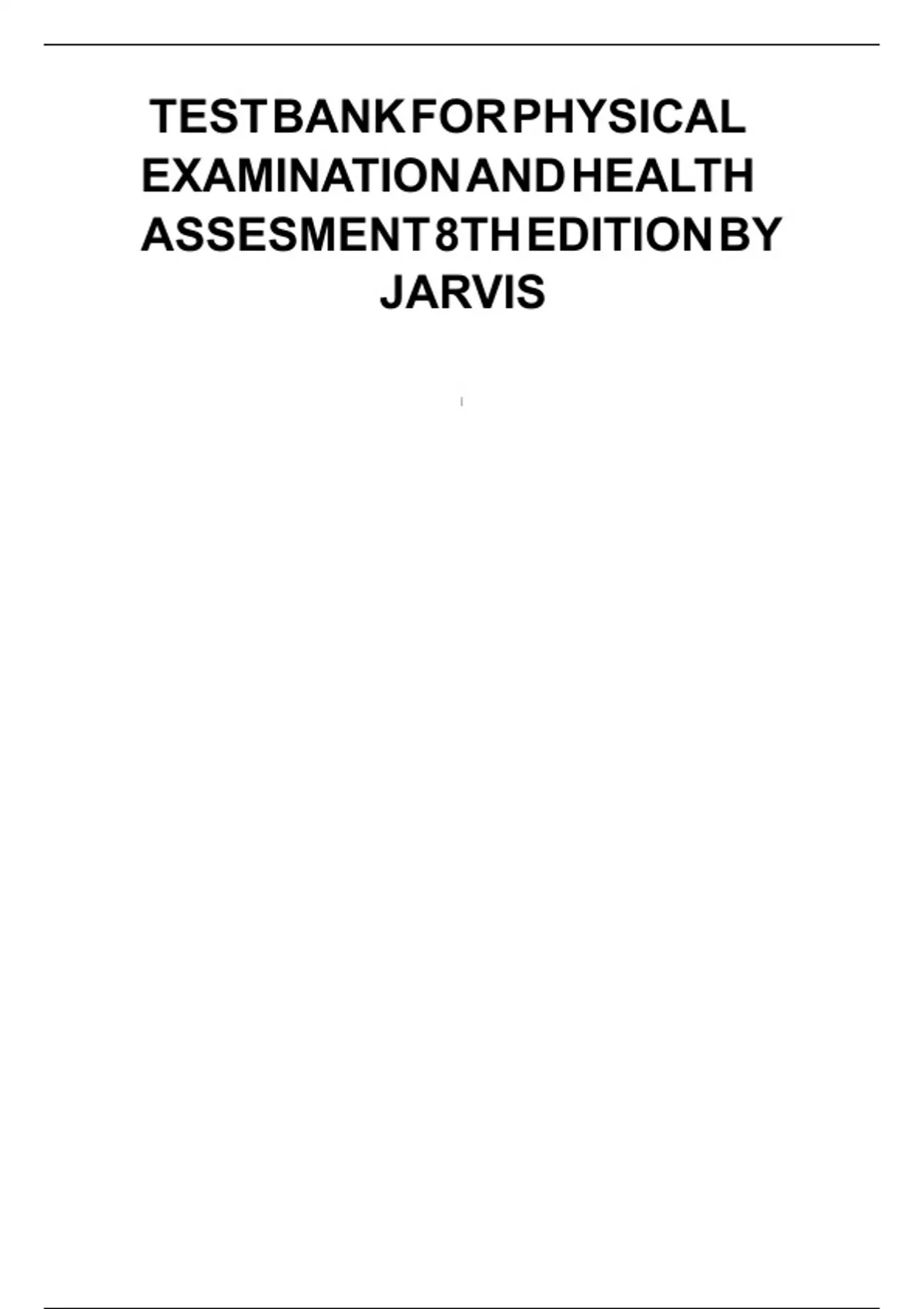 This document is a complete test bank for the 8th edition of Physical Examination and Health Assessment by Carolyn Jarvis. It contains hundreds of multiple-choice questions and answers, covering all chapters and key topics in the textbook. Ideal for nursing students preparing for exams, quizzes, or clinical assessments.This document is a complete test bank for the 8th edition of Physical Examination and Health Assessment by Carolyn Jarvis. It contains hundreds of multiple-choice questions and answers, covering all chapters and key topics in the textbook. Ideal for nursing students preparing for exams, quizzes, or clinical assessments.This document is a complete test bank for the 8th edition of Physical Examination and Health Assessment by Carolyn Jarvis. It contains hundreds of multiple-choice questions and answers, covering all chapters and key topics in the textbook. Ideal for nursing students preparing for exams, quizzes, or clinical assessments.This document is a complete test bank for the 8th edition of Physical Examination and Health Assessment by Carolyn Jarvis. It contains hundreds of multiple-choice questions and answers, covering all chapters and key topics in the textbook. Ideal for nursing students preparing for exams, quizzes, or clinical assessments.This document is a complete test bank for the 8th edition of Physical Examination and Health Assessment by Carolyn Jarvis. It contains hundreds of multiple-choice questions and answers, covering all chapters and key topics in the textbook. Ideal for nursing students preparing for exams, quizzes, or clinical assessments.This document is a complete test bank for the 8th edition of Physical Examination and Health Assessment by Carolyn Jarvis. It contains hundreds of multiple-choice questions and answers, covering all chapters and key topics in the textbook. Ideal for nursing students preparing for exams, quizzes, or clinical assessments.This document is a complete test bank for the 8th edition of Physical Examination and Health Assessment by Carolyn Jarvis. It contains hundreds of multiple-choice questions and answers, covering all chapters and key topics in the textbook. Ideal for nursing students preparing for exams, quizzes, or clinical assessments.This document is a complete test bank for the 8th edition of Physical Examination and Health Assessment by Carolyn Jarvis. It contains hundreds of multiple-choice questions and answers, covering all chapters and key topics in the textbook. Ideal for nursing students preparing for exams, quizzes, or clinical assessments.This document is a complete test bank for the 8th edition of Physical Examination and Health Assessment by Carolyn Jarvis. It contains hundreds of multiple-choice questions and answers, covering all chapters and key topics in the textbook. Ideal for nursing students preparing for exams, quizzes, or clinical assessments.This document is a complete test bank for the 8th edition of Physical Examination and Health Assessment by Carolyn Jarvis. It contains hundreds of multiple-choice questions and answers, covering all chapters and key topics in the textbook. Ideal for nursing students preparing for exams, quizzes, or clinical assessments.