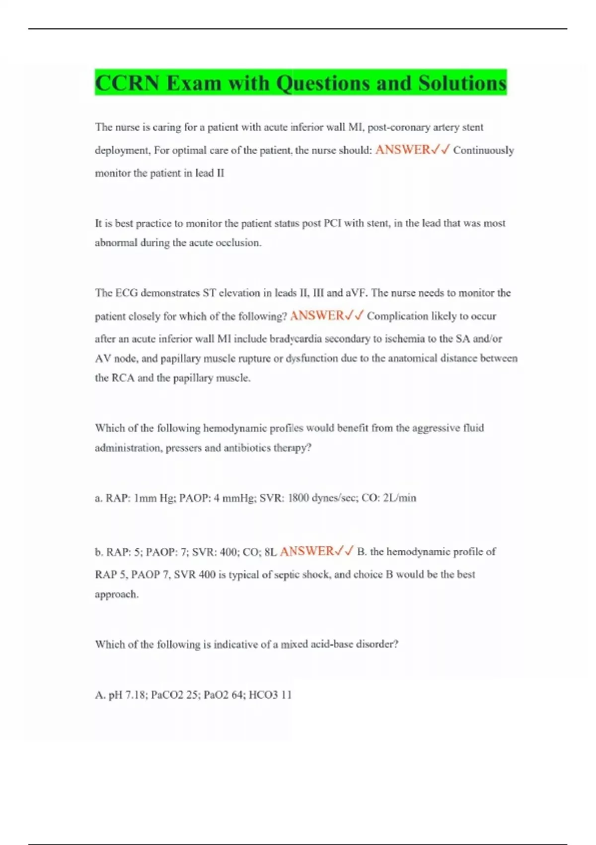 CCRN Exam with Questions and Solutions The nurse is caring for a patient with acute inferior wall MI, post-coronary artery stent deployment, For optimal care of the patient, the nurse should: ANSWER Continuously monitor the patient in lead II It is best practice to monitor the patient status post PCI with stent, in the lead that was most abnormal during the acute occlusion. The ECG demonstrates ST elevation in leads II, III and aVF. The nurse needs to monitor the patient closely for which of the following? ANSWER Complication likely to occur after an acute inferior wall MI include bradycardia secondary to ischemia to the SA and/or AV node, and papillary muscle rupture or dysfunction due to the anatomical distance between the RCA and the papillary muscle. Which of the following hemodynamic profiles would benefit from the aggressive fluid administration, pressers and antibiotics therapy? a. RAP: 1mm Hg; PAOP: 4 mmHg; SVR: 1800 dynes/sec; CO: 2L/min b. RAP: 5; PAOP: 7; SVR: 400; CO; 8L ANSWER B. the hemodynamic profile of RAP 5, PAOP 7, SVR 400 is typical of septic shock, and choice B would be the best approach. Which of the following is indicative of a mixed acid-base disorder? A. pH 7.18; PaCO2 25; PaO2 64; HCO3 11