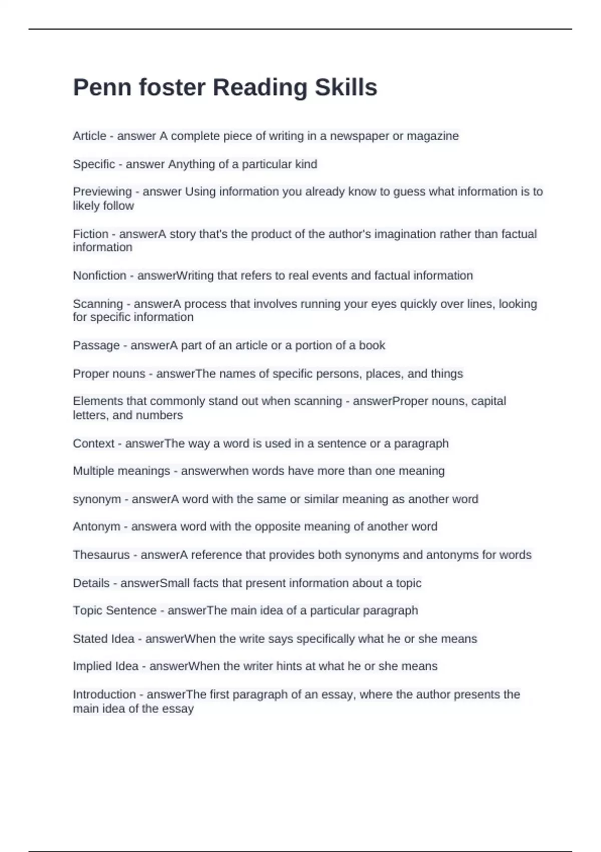 Penn foster Reading Skills Questions and Answers Fully Solved