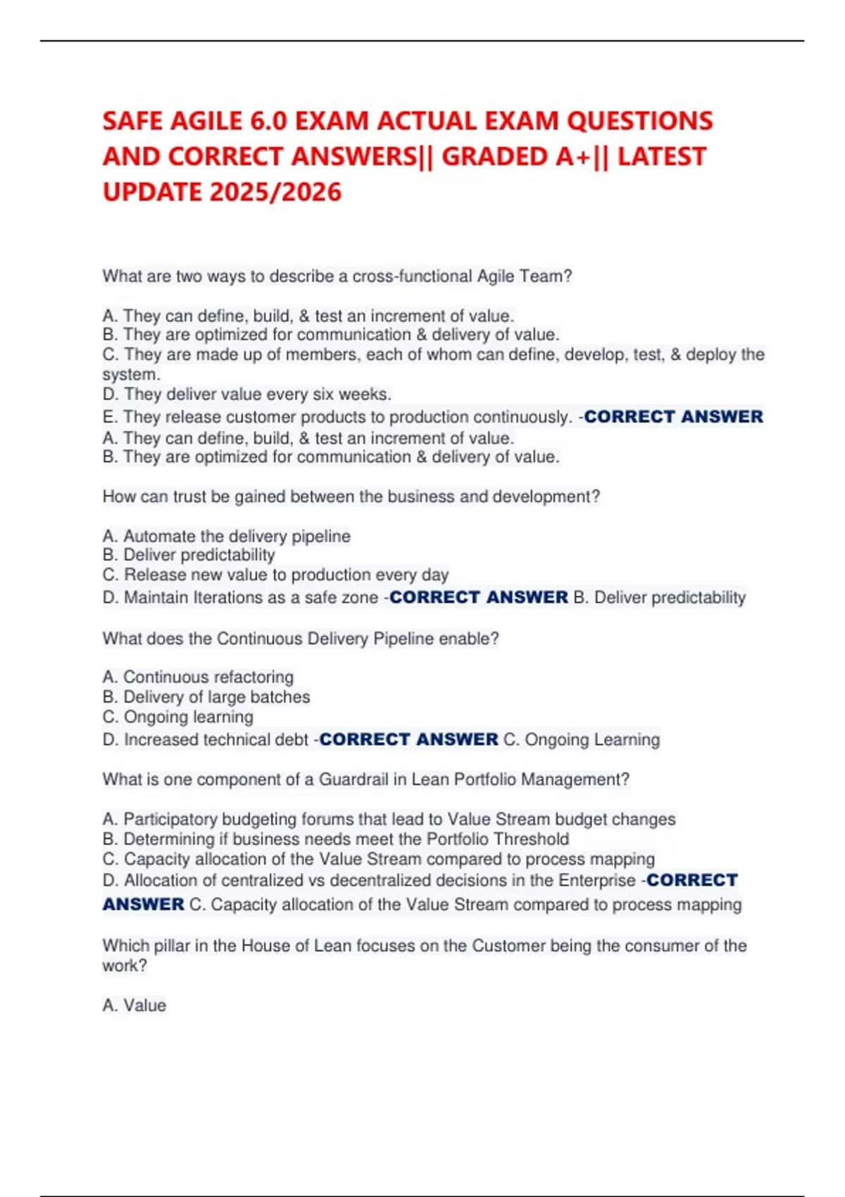 SAFE AGILE 6.0 EXAM ACTUAL EXAM QUESTIONS AND CORRECT ANSWERS|| GRADED A+|| LATEST UPDATE 2025/2026