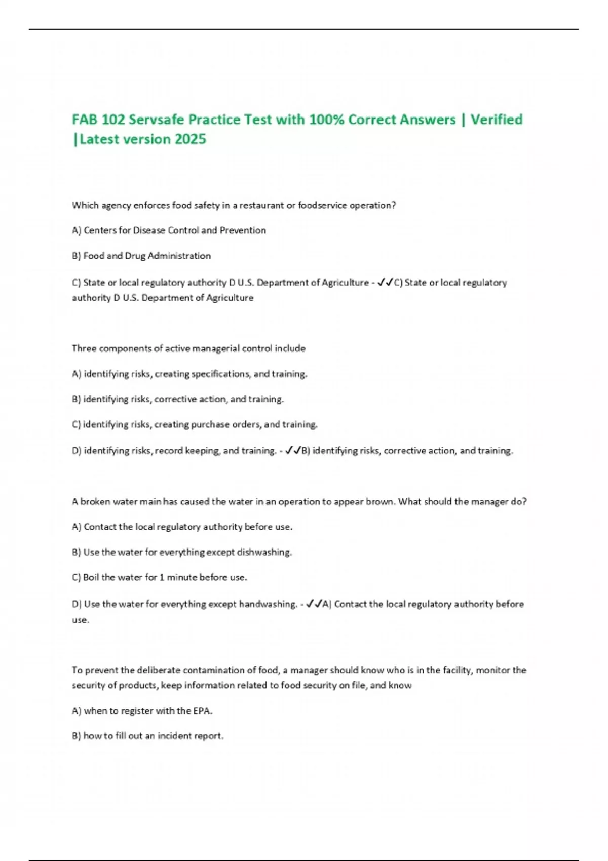 FAB 102 Servsafe Practice Test with 100% Correct Answers | Verified |Latest version 2025
