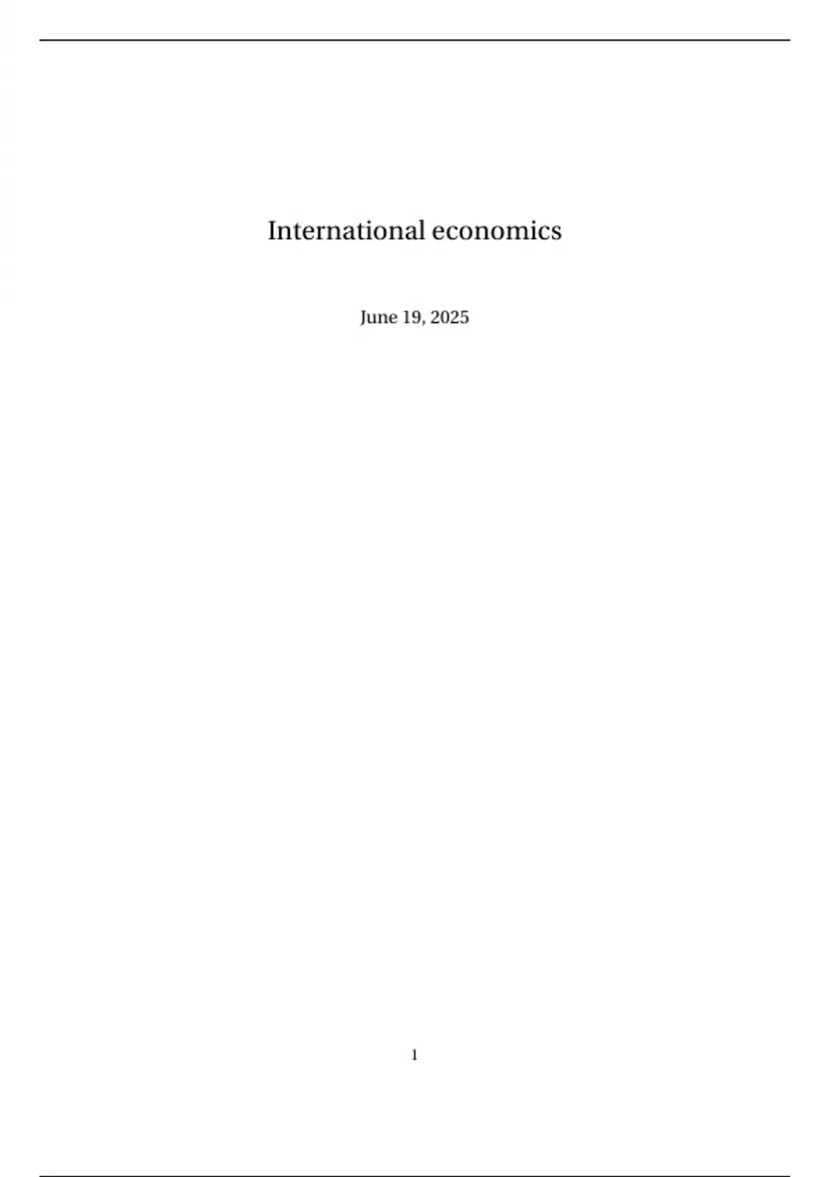 This summary provides an overview of essential concepts in international economics, including trade theories, exchange rates, and the impact of globalization. Designed to help students grasp the complexities of global economic interactions, this concise resource is perfect for exam preparation and coursework support. Enhance your understanding of international economics with this valuable summary available on Stuvia!