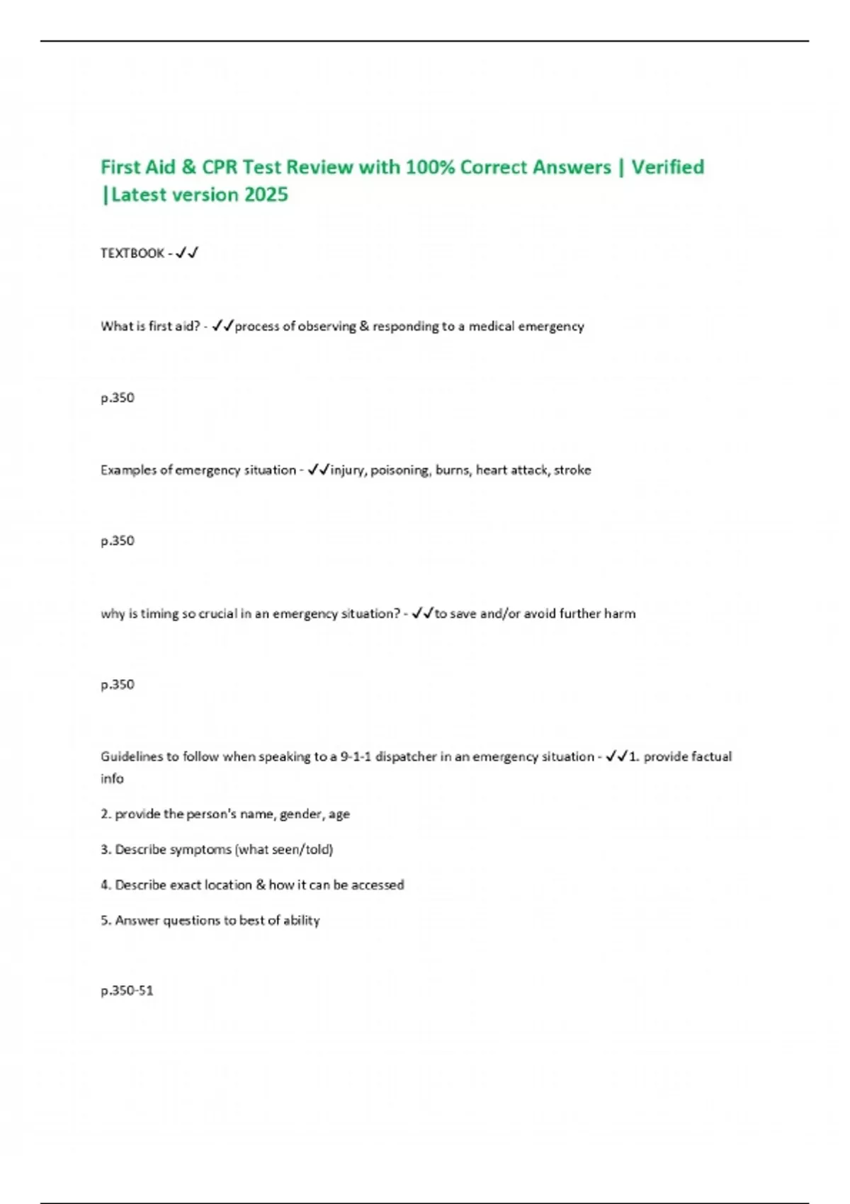 First Aid & CPR Test Review with 100% Correct Answers | Verified |Latest version 2025