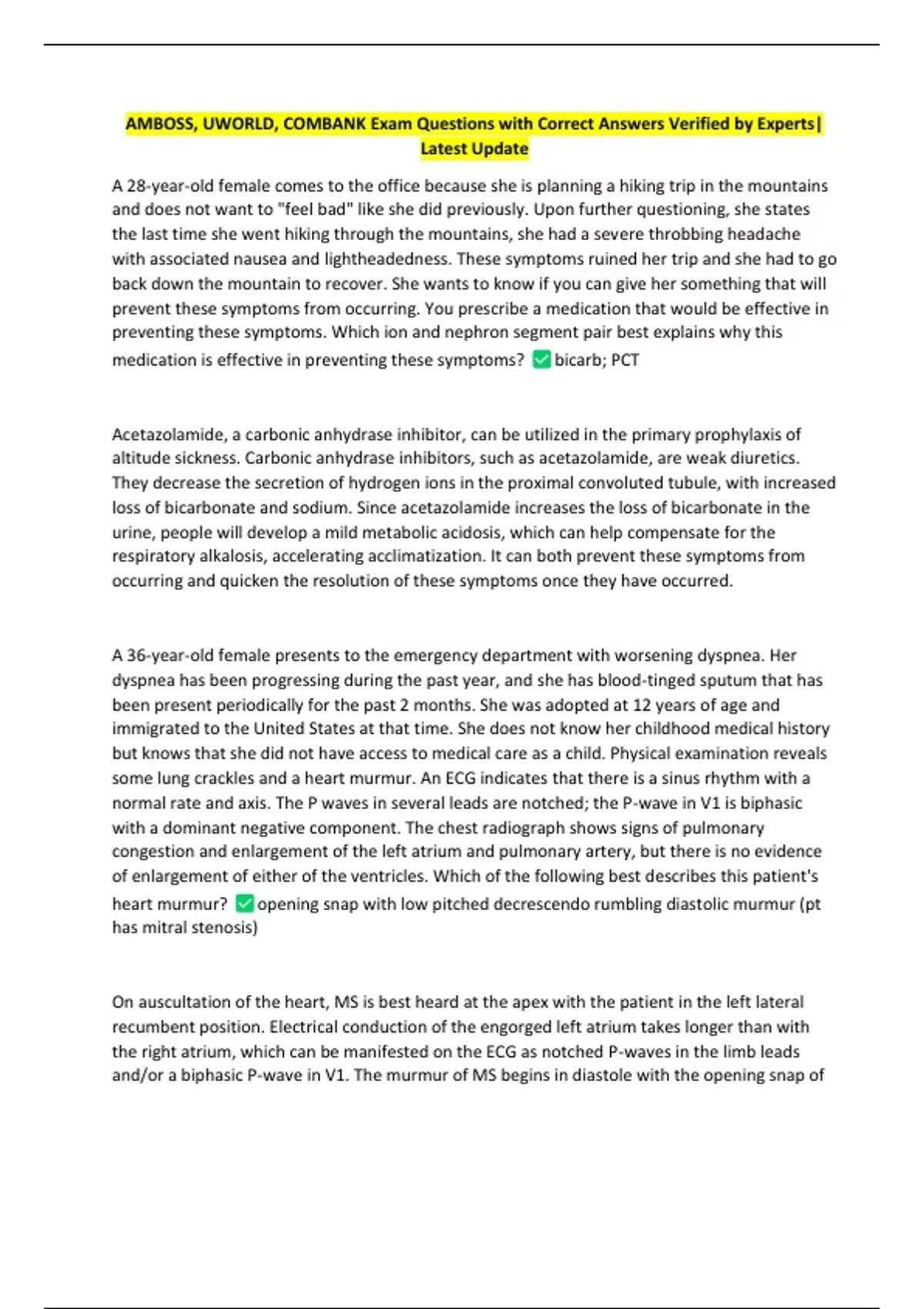 AMBOSS, UWORLD, COMBANK Exam Questions with Correct Answers Verified by Experts| Latest Update